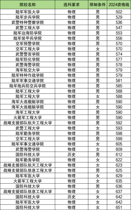 陆军军医大学(选科物理,502分)、陆军步兵学院(选科物理,529分)、武警特种警察学院(选科物理,536分)、武警工程大学(选科物理,547分)、陆军边海防学院(选科物理,553分)等。