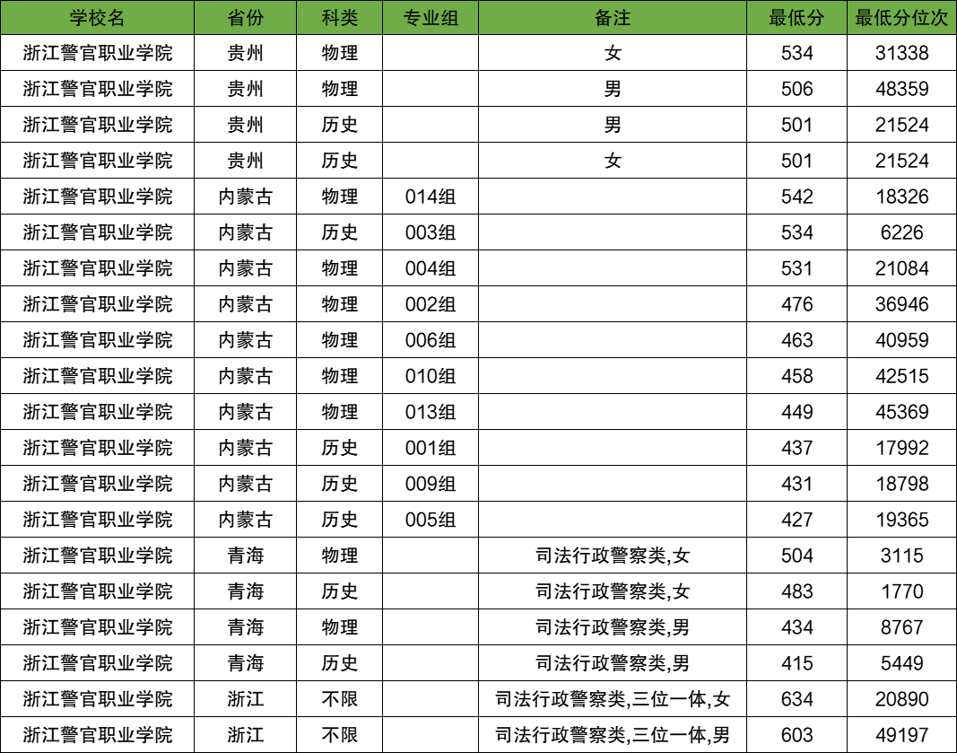 2025年浙江警官职业学院录取分数线部分省份已公布,贵州专科提前批历史类最低501分,物理类最低506分;更多省份具体录取分数线详情见下文。