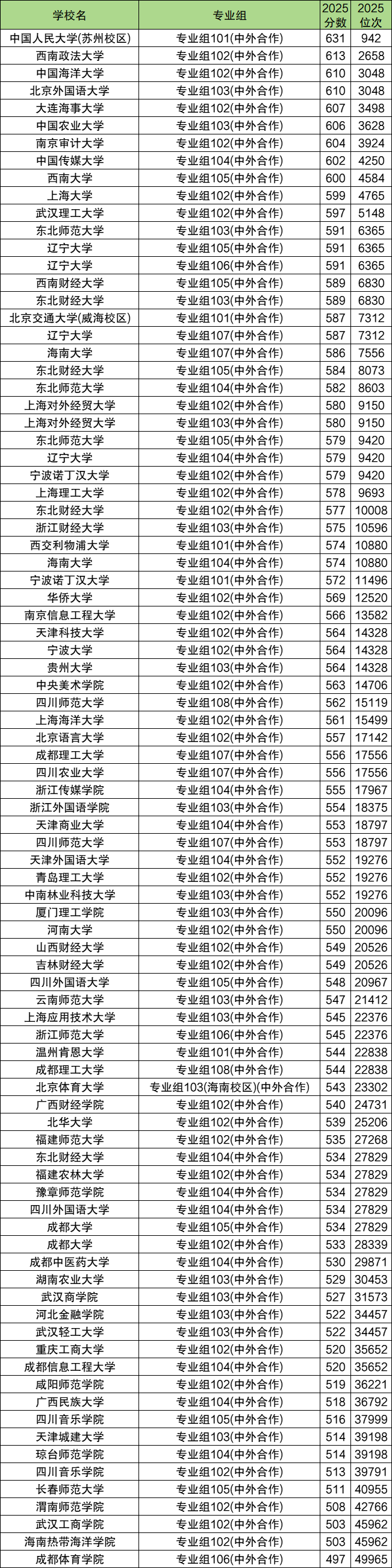 2025年中外合作办学录取分数线范围在497分到631分之间,最低分是成都体育学院的106组(中外合作),2025年497分录取。最高的是中国人民大学(苏州校区)的101组(中外合作),2025年631分录取。