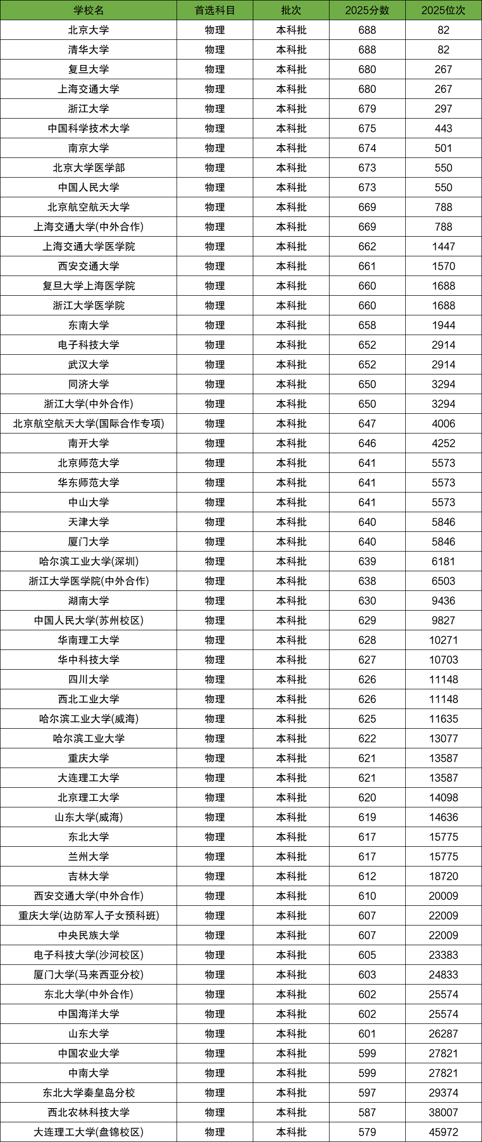 2025年全国985大学在河北物理类录取分数线一览表: