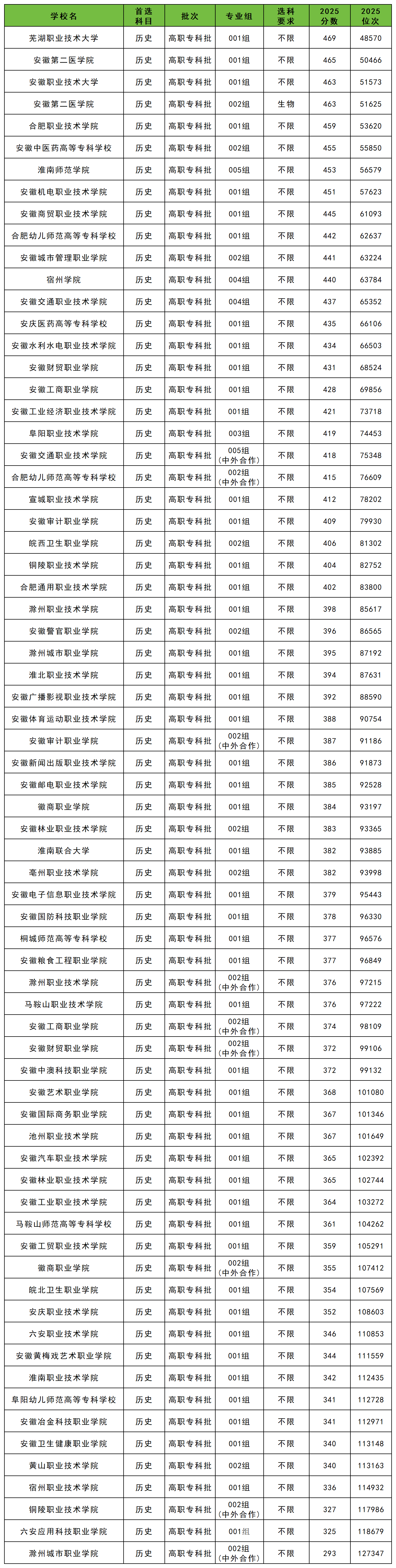 2025年安徽省公办专科大学在安徽省本省历史类的分数线为293分-469分之间,历史类录取分数线最高的是芜湖职业技术大学001组,最低分为469分,最低位次为第48570名;其次是安徽第二医学院001组,最低分为465分,最低位次为第50466名。