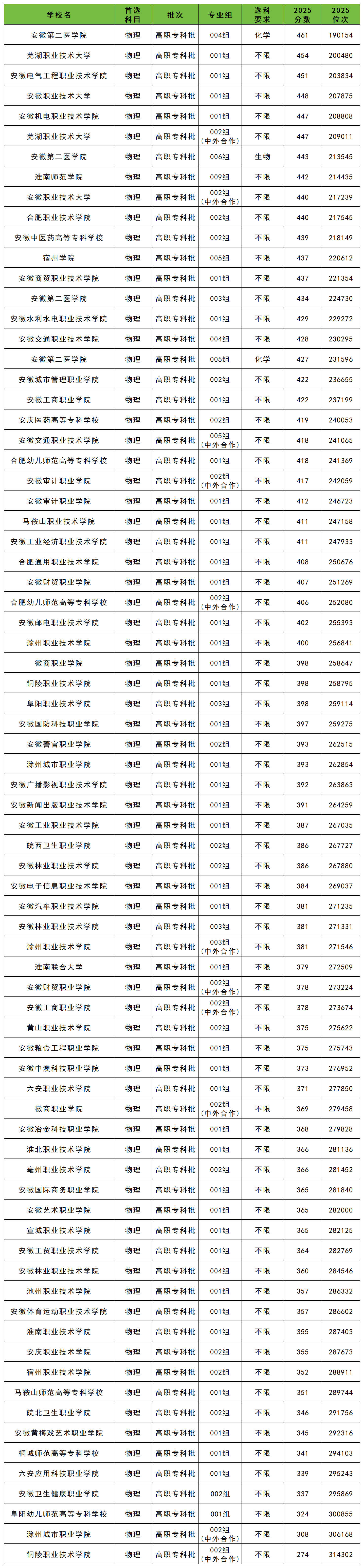 2025年安徽省公办专科大学在安徽省本省物理类的分数线为274分-461分之间,物理类录取分数线最高的是安徽第二医学院004组,最低分为461分,最低位次为第190154名;其次是芜湖职业技术大学001组,最低分为454分,最低位次为200480名。