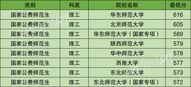 陕西师范大学:579分、西南大学:577分、华中师范大学:578分、东北师范大学:572分、华东师范大学:589分、北京师范大学:605分。