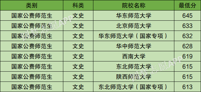 东北师范大学:613分、陕西师范大学:615分、西南大学:619分、华中师范大学:628分、北京师范大学:633分、华东师范大学:632分。
