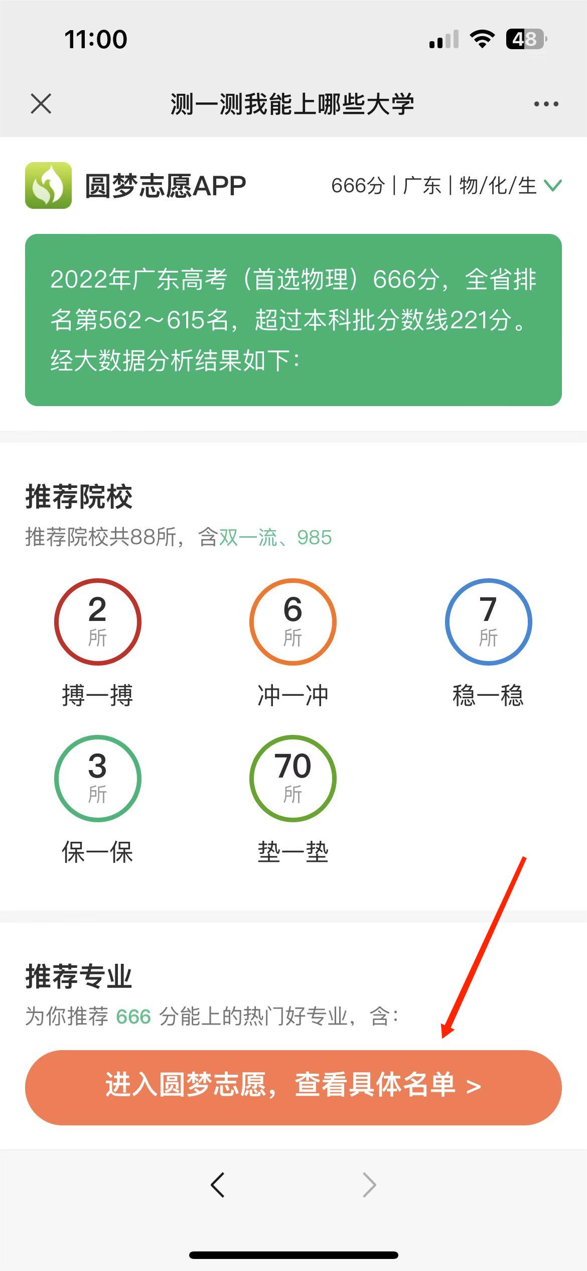 2、点击圆梦志愿,查看具体名单即可一键进入圆梦志愿小程序,系统会智能的为您推算出广东一模成绩能上的大学。如图(数据仅作示例):