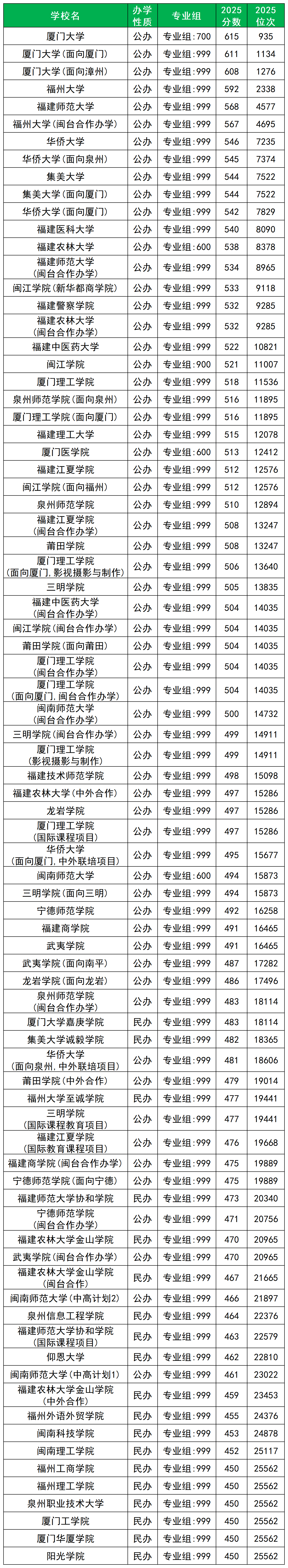 福建历史组本科各大学录取分数线最低的是:阳光学院、厦门华厦学院等6所,2025年最低分数线是450分,位次排名是25562位。