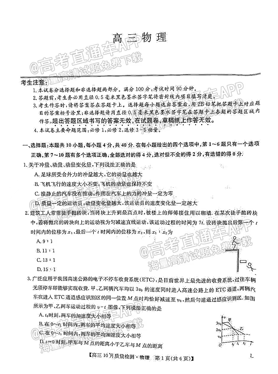 2023江西九师联盟将于10月26日开考,等物理的考试考完,同学们应该很想知道物理考的怎样,以便对自己的成绩有个预估,从而更清楚当前的学习状况。在本文,小编为大家整理了2023江西九师联盟高三10月联考物理试题及答案解析,供同学们参考。