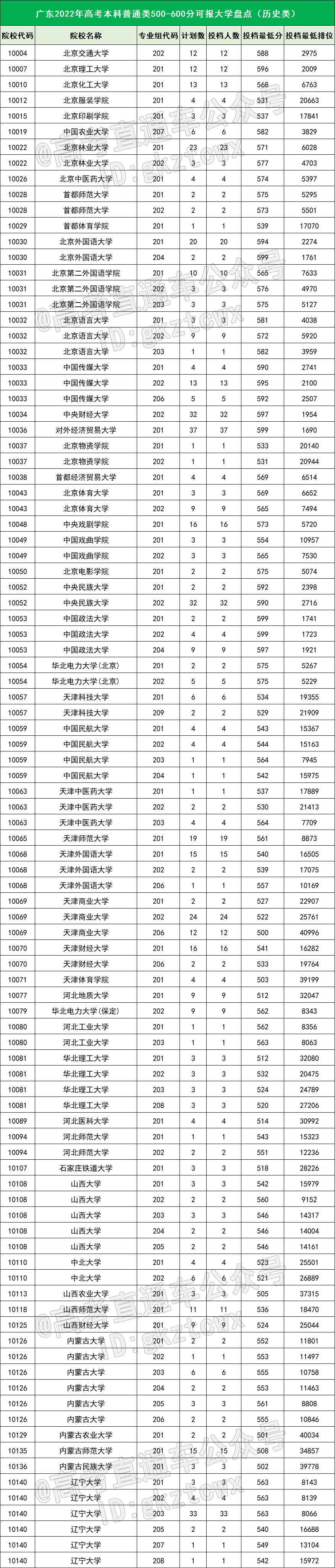根据广东2022年高考本科普通类500-600分段的大学名单可以看到,广东高考历史类考生500分-600分可以报考的大学分别有北京交通大学、北京理工大学、北京化工大学、北京服装学院、北京印刷学院、中国农业大学、北京林业大学、北京中医药大学、首都师范大学、北京外国语大学、北京语言大学、中国传媒大学、中央财经大学、北京物资学院、中国民航大学、天津中医药大学等院校,其中有不少的211、双一流大学可供广东历史类高考500-600分段考生选择。