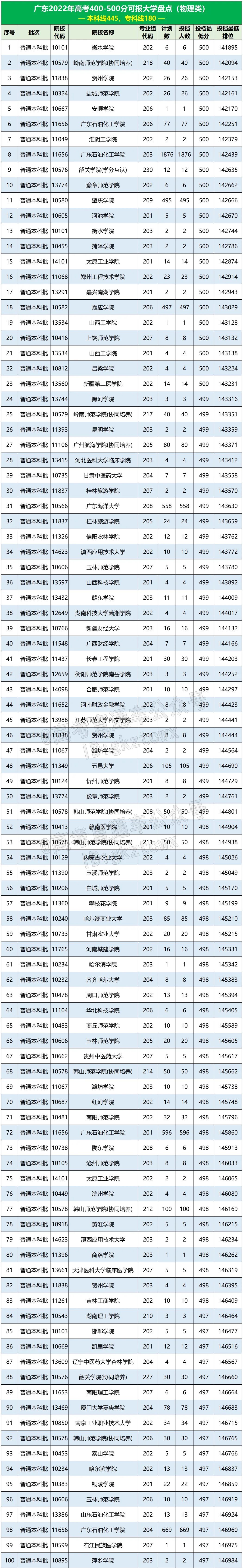 根据广东2022年高考本科普通类400-500分段的大学名单可以看到,广东高考物理类考生400-500分可以报考的大学分别有衡水学院(500分)、菏泽学院(500分)、太原工业学院(500分)、忻州师范学院(499分)、赣南医学院(498分)、玉林师范学院(498分)、贵州中医药大学(498分)、南阳理工学院(497分)、南京工业职业技术大学(497分)、萍乡学院(497分)等院校,广东文科类400-500分可以选择的大学院校基本为民办学院,也有部分公办院校可供广东物理类高考400-500分段考生选择。