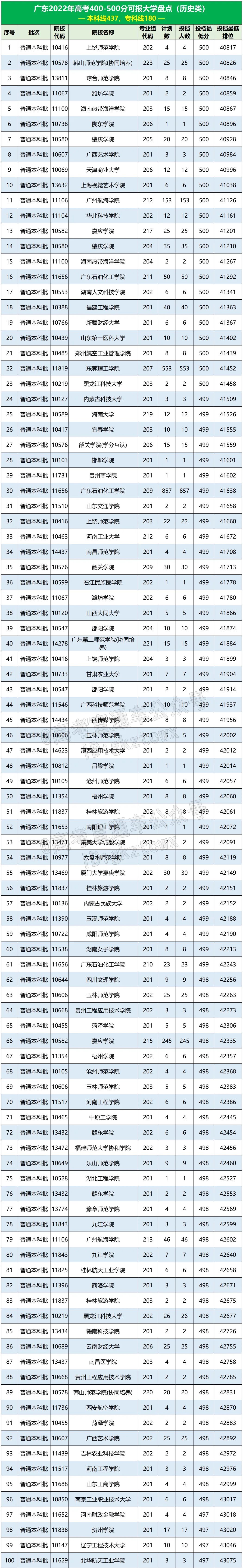 根据广东2022年高考本科普通类400-500分段的大学名单可以看到,广东高考历史类考生400-500分可以报考的大学分别有上饶师范学院(500分)、韩山师范学院(500分)、肇庆学院(500分)、海南热带海洋学院(500分)、东莞理工学院(500分)、山东第一医科大学(500分)、三亚学院(488分)、长江大学文理学院(487分)、四川大学锦江学院(489分)、湖北恩施学院(489分)、西南财经大学天府学院(489分)等院校,广东历史类400-500分可以选择的大学院校基本为民办学院,也有部分公办院校可供广东历史类高考400-500分段考生选择。