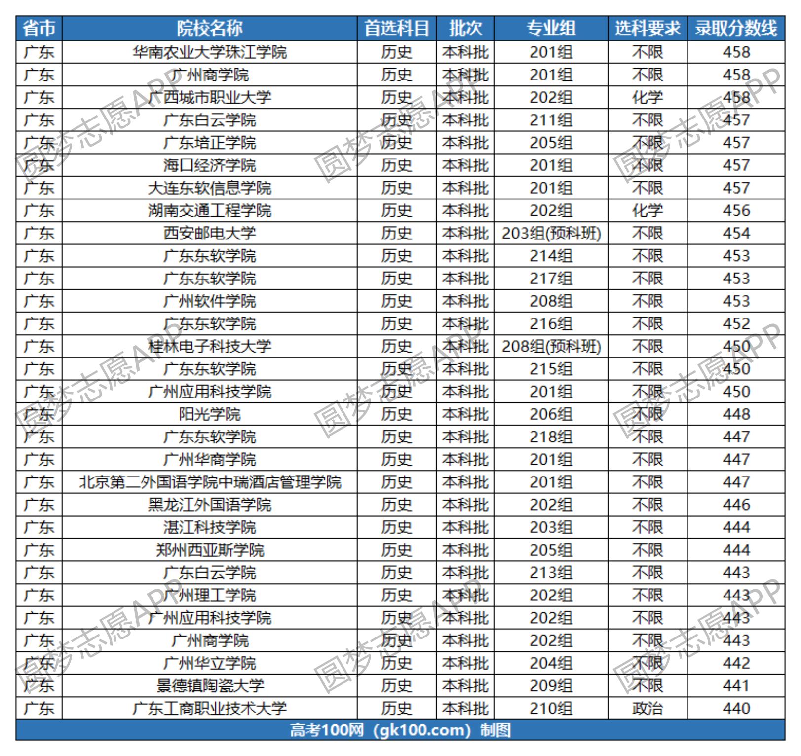 1)华南农业大学珠江学院,2022年在广东历史类最低录取分数线为458分;