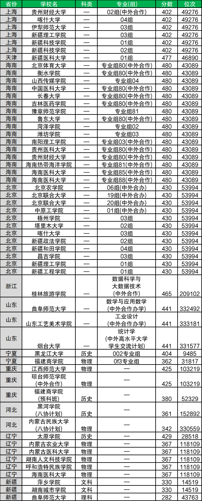 历史类:新疆第二医学院(617组)、海南热带海洋学院(中外合作)(999组),最低分均为450分,压本科线录取。