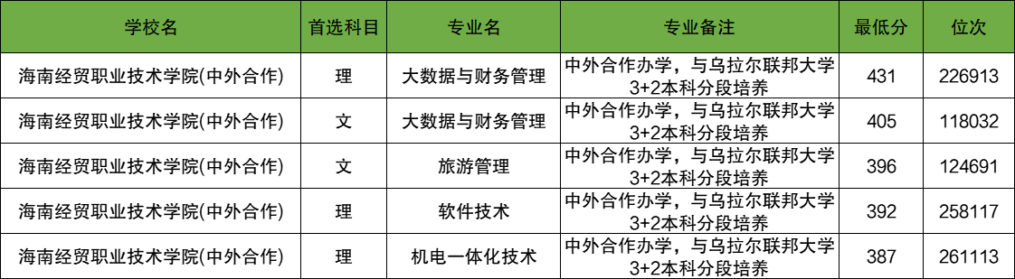 四川理科3+2专本贯通录取分数线最低是387分,录取分数线最低的学校为海南经贸职业技术学院机电一体化技术专业。最难考的则是海南经贸职业技术学院大数据与财务管理专业,2024年最低分是431分。