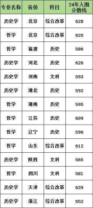 可见不同专业在不同省份的招生分数门槛各有差异,下面以历史学、哲学为例,列举各省入围最低分: