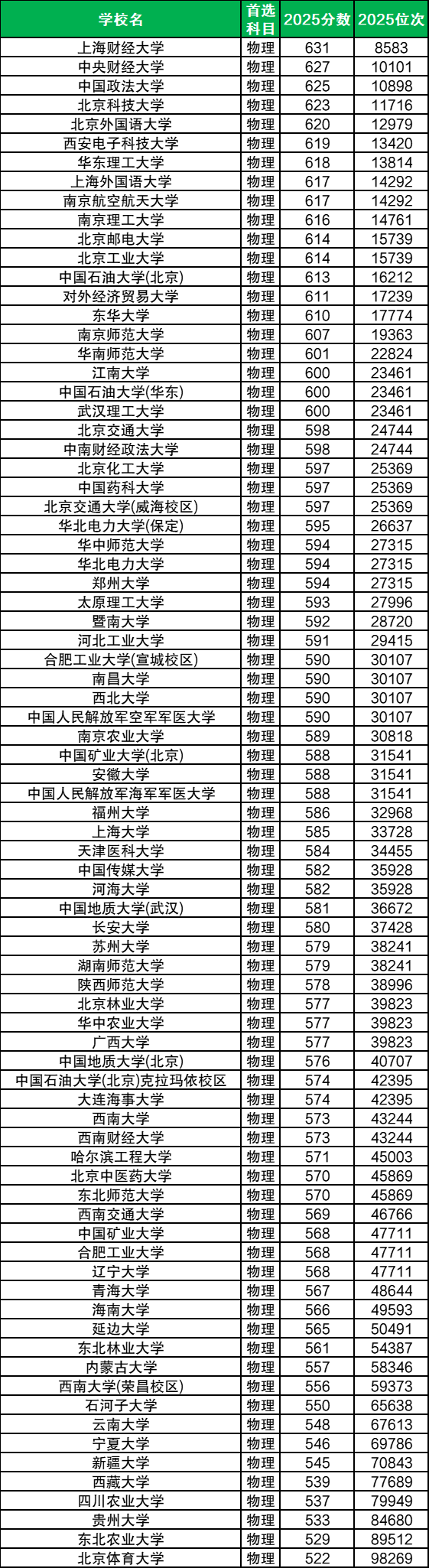 1)上海财经大学,2025年最低录取分数线631分;