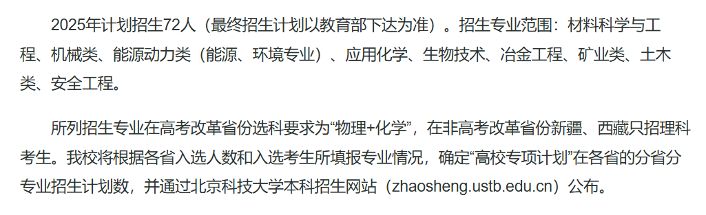 北科大专项计划紧扣学校“钢铁绿色化、材料高端化”发展特色,2025年预计覆盖理科类、工科类大领域: