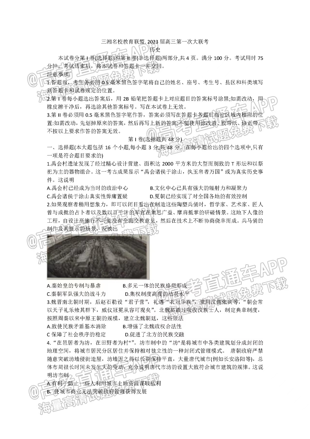 一、2023湖南三湘名校第一次联考测试历史试卷及答案详情