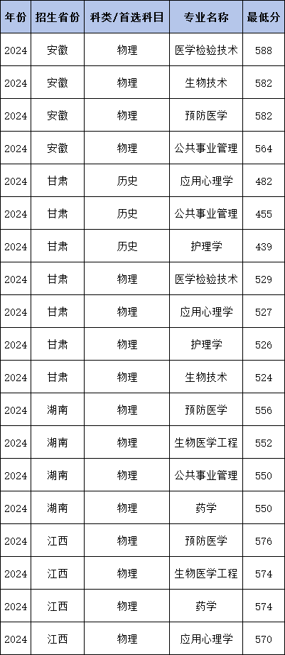 2024年广州医科大学国家专项计划在安徽录取最低分物理类为564分,物理组收分最低的专业为公共事业管理。