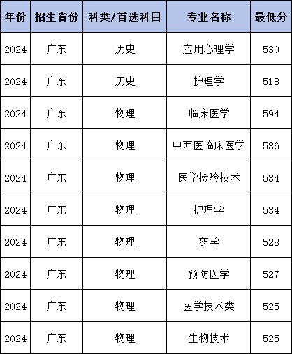 2024年广州医科大学地方专项计划在广东录取最低分历史类为518分、物理类为525分,历史组收分最低的专业为护理学、物理组收分最低的专业为医学技术类和生物技术。