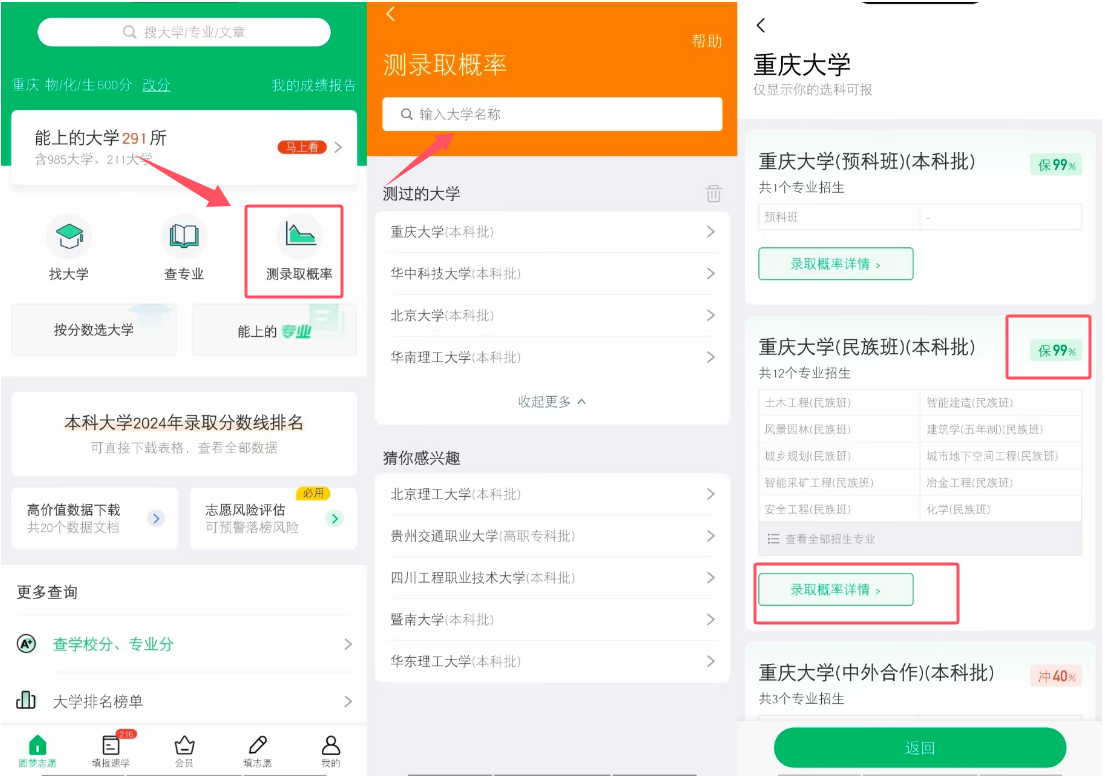 除了输入分数选大学外,圆梦志愿APP还提供免费测试大学录取概率的功能。考生可以在APP内选择心仪的院校,系统即可根据考生的分数和位次,结合历年的录取数据,评估出考生被该院校录取的概率。