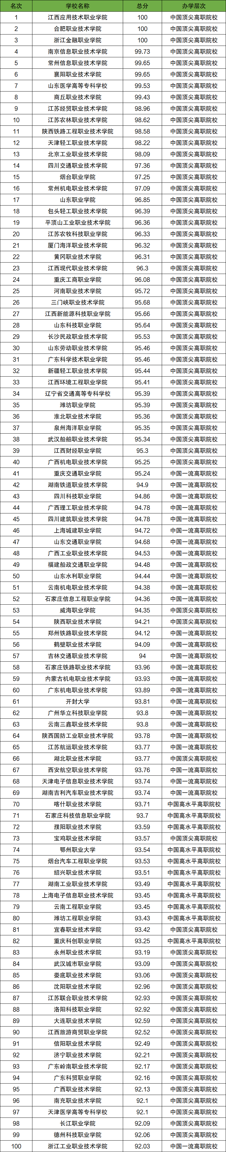 以下是校友会2026年全国专科学校最新排名前100名一览表: