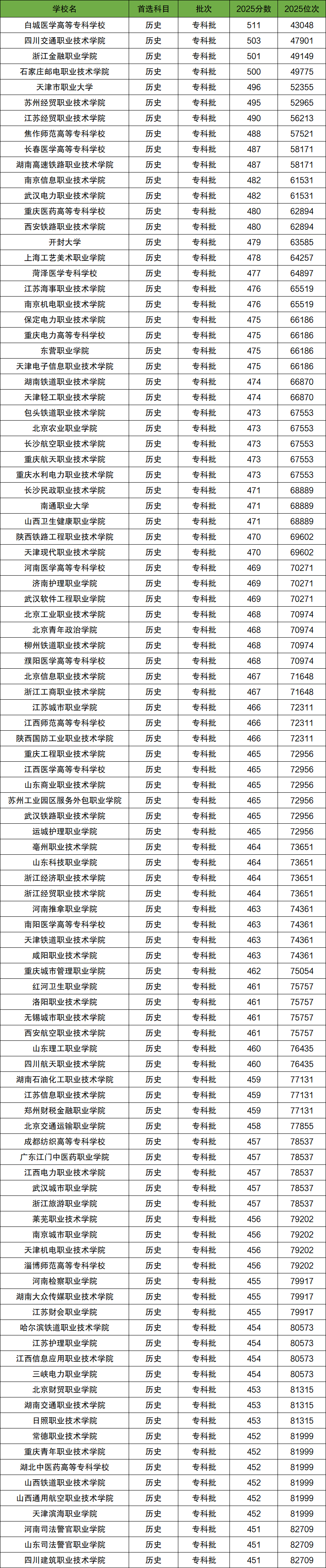 2025年全国专科学校在河北历史类录取分数线排名前100名一览表: