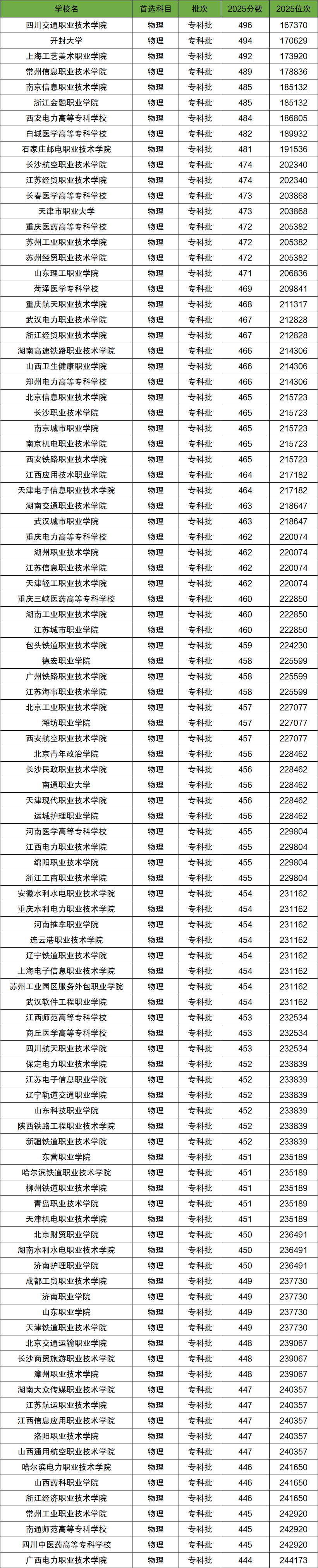 2025年全国专科学校在河北物理类录取分数线排名前100名一览表: