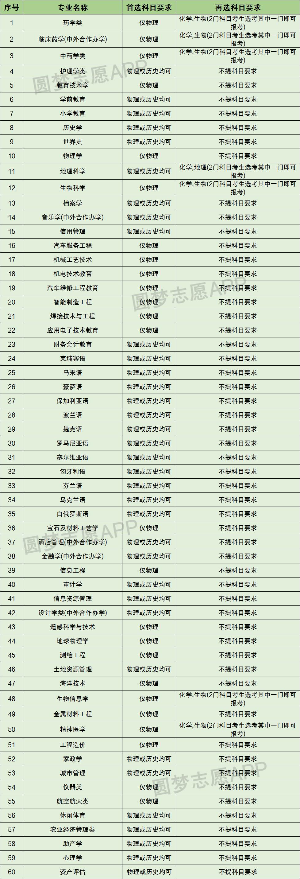 再选科目要求为不提科目要求、地理(1门科目考生必须选考)、化学,地理(2门科目考生选考其中一门即可)、化学,生物(2门科目考生选考其中一门)、生物(1门科目考生必须选考)、生物,地理(2门科目考生选考其中一门)