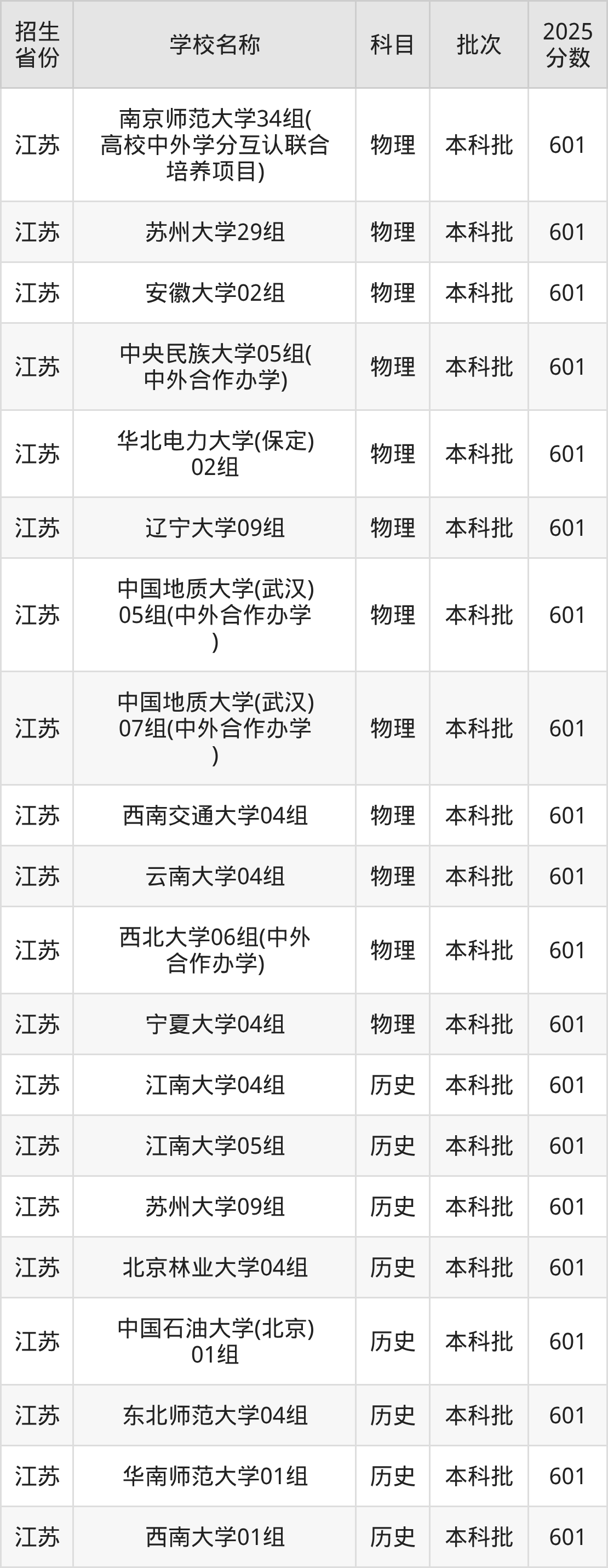 江苏省物理组分数线是601分的211大学有:南京师范大学、苏州大学、安徽大学、中央民族大学、华北电力大学(保定)、辽宁大学、中国地质大学(武汉)、西南交通大学、云南大学、西北大学。