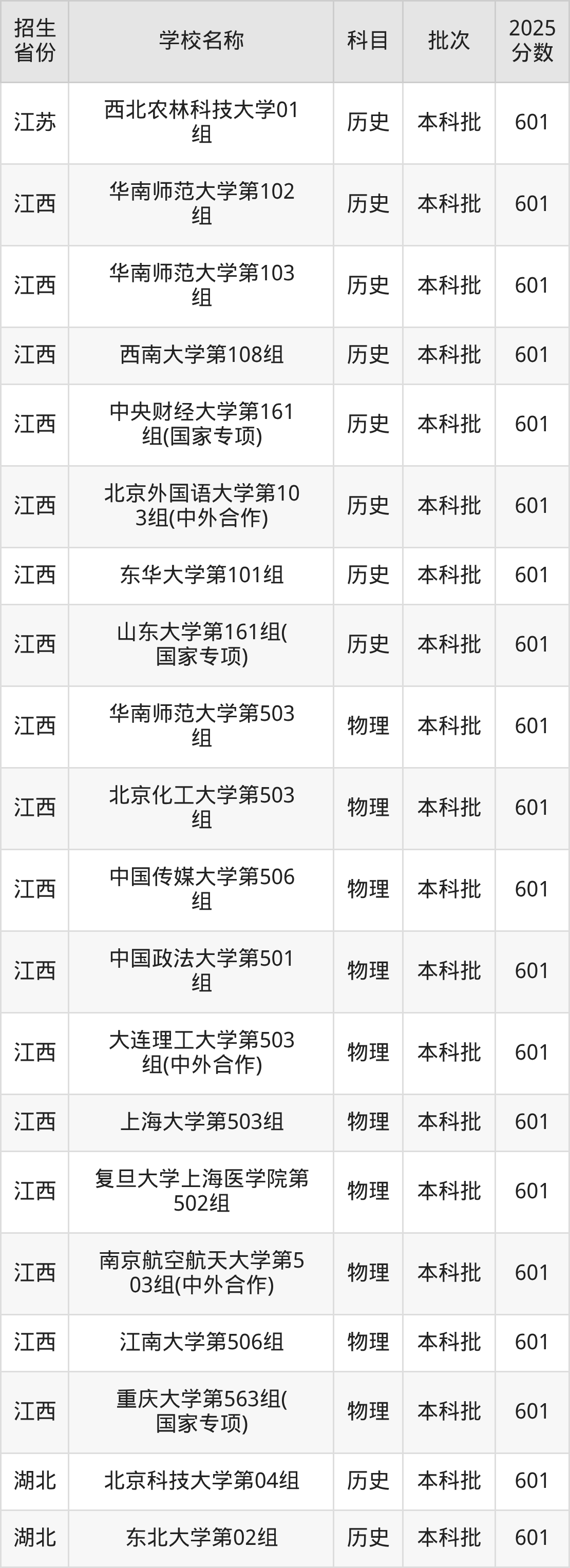 江西省物理组分数线是601分的211大学有:华南师范大学、北京化工大学、中国传媒大学、中国政法大学、大连理工大学、上海大学、复旦大学上海医学院、南京航空航天大学、江南大学、重庆大学。