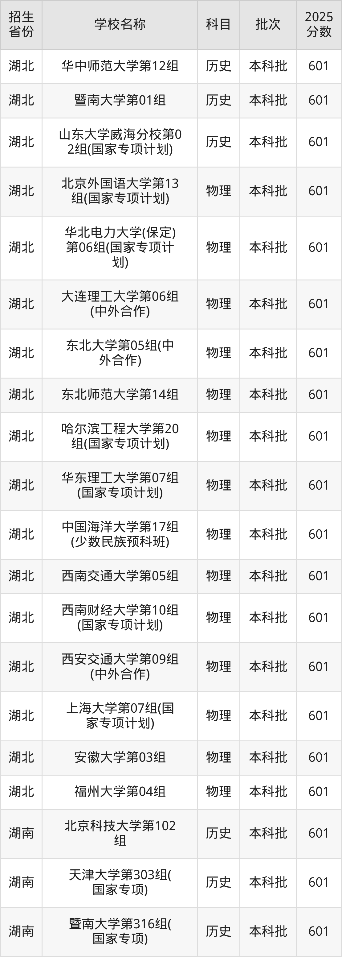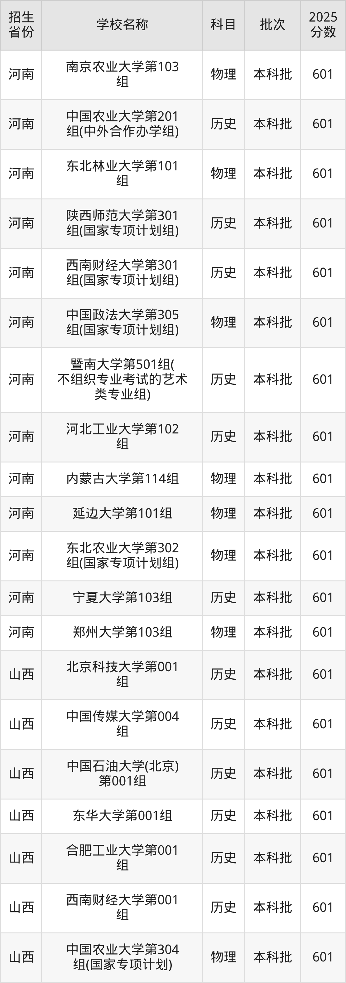 筛选全国各省2025年录取分数线为601分的211大学如下: