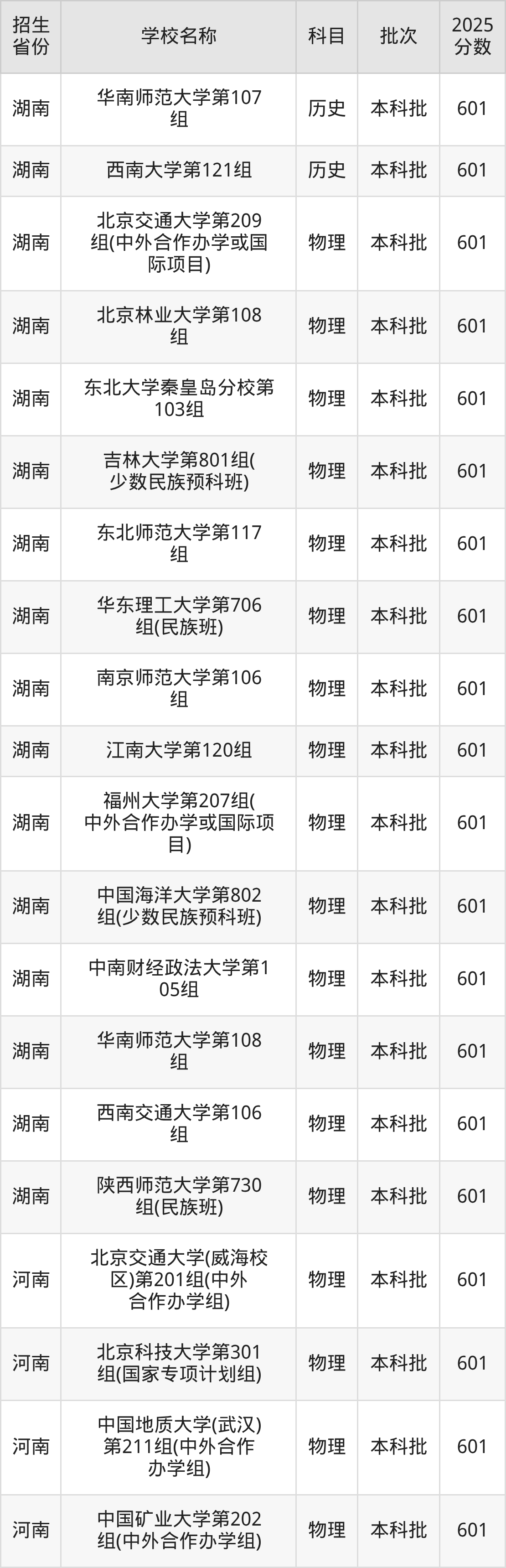湖南省物理组分数线是601分的211大学有:北京交通大学、北京林业大学、东北大学秦皇岛分校、吉林大学、东北师范大学、华东理工大学、南京师范大学、江南大学、福州大学、中国海洋大学。