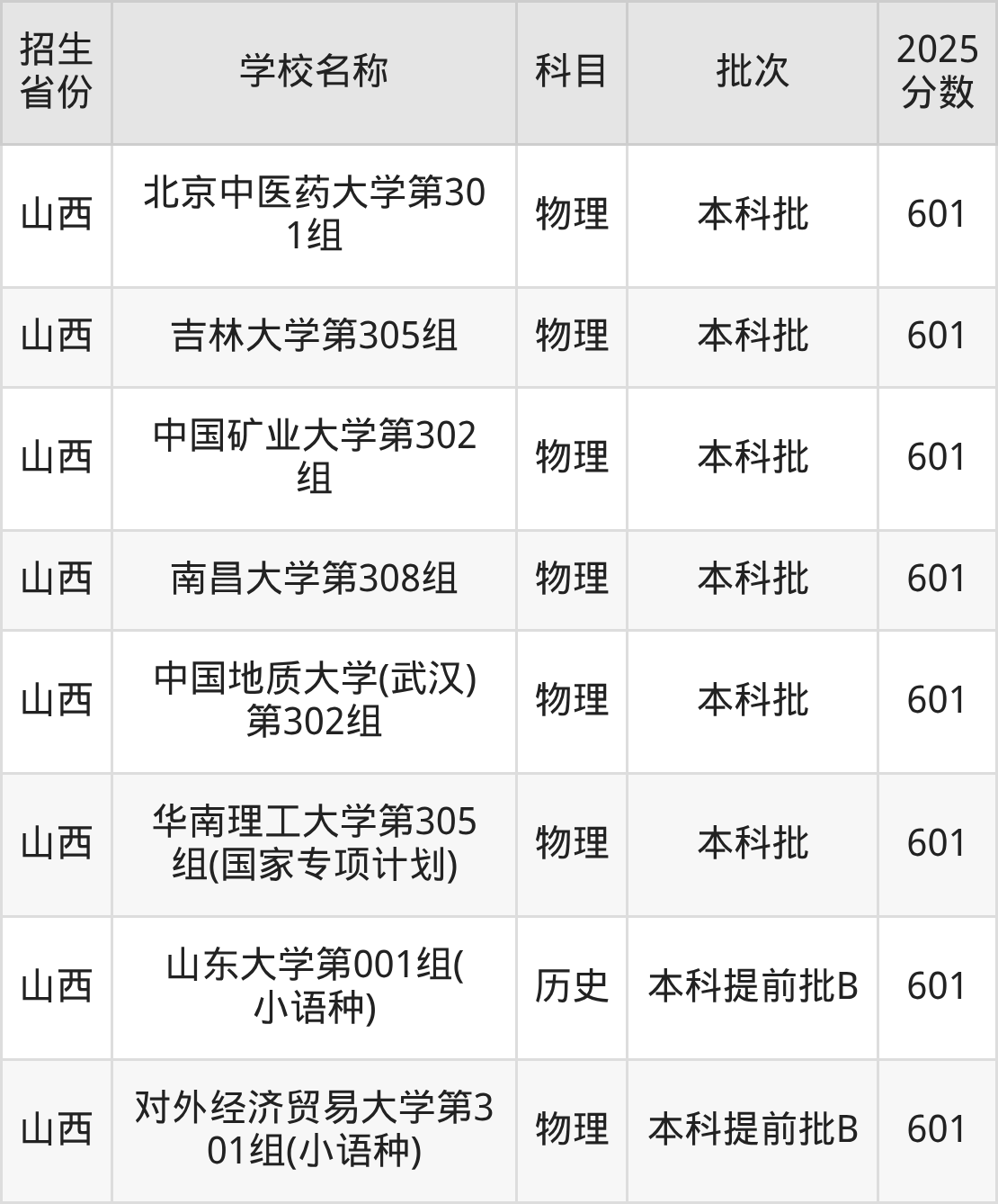 山西省物理组分数线是601分的211大学有:中国农业大学、北京中医药大学、吉林大学、中国矿业大学、南昌大学、中国地质大学(武汉)、华南理工大学、对外经济贸易大学。