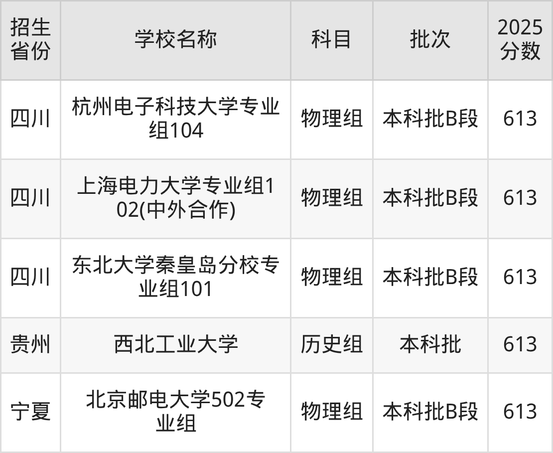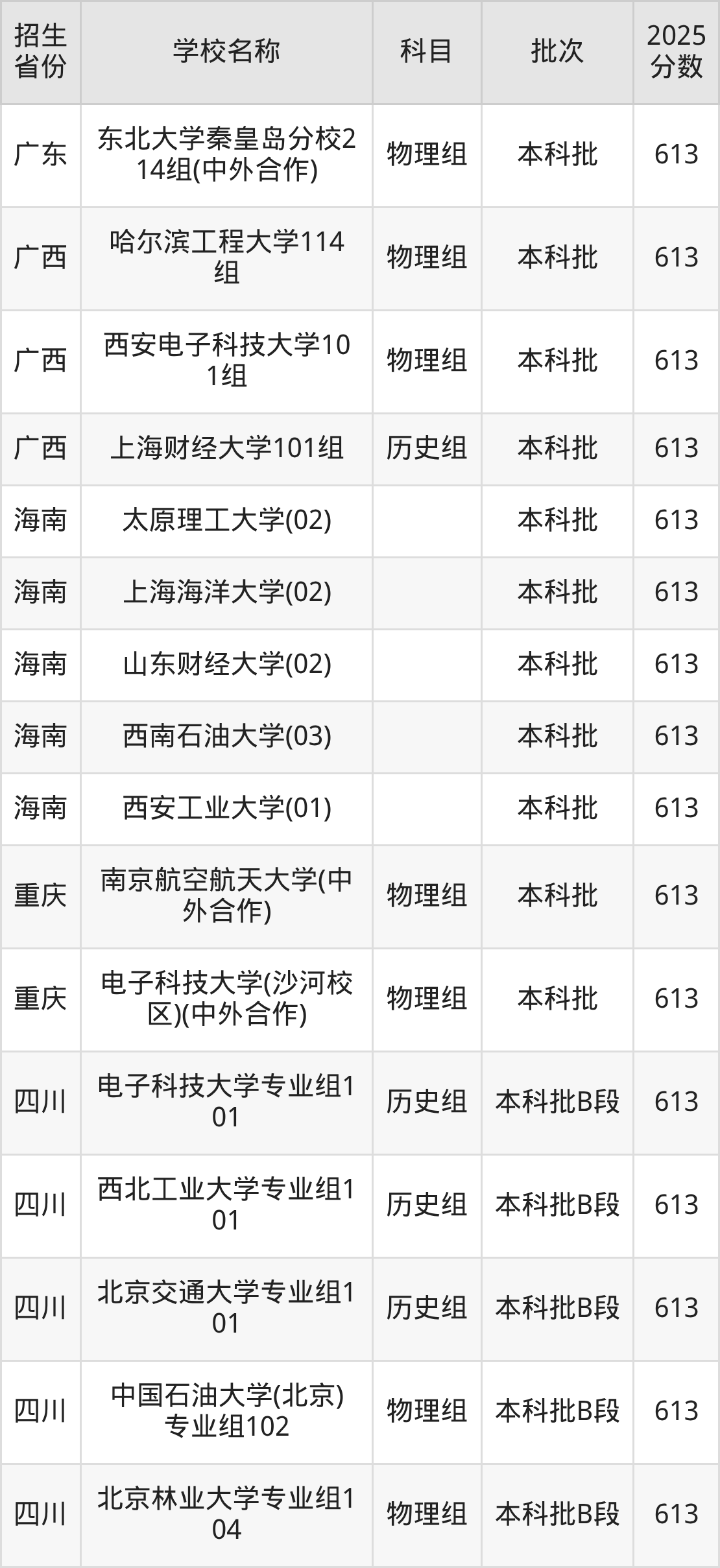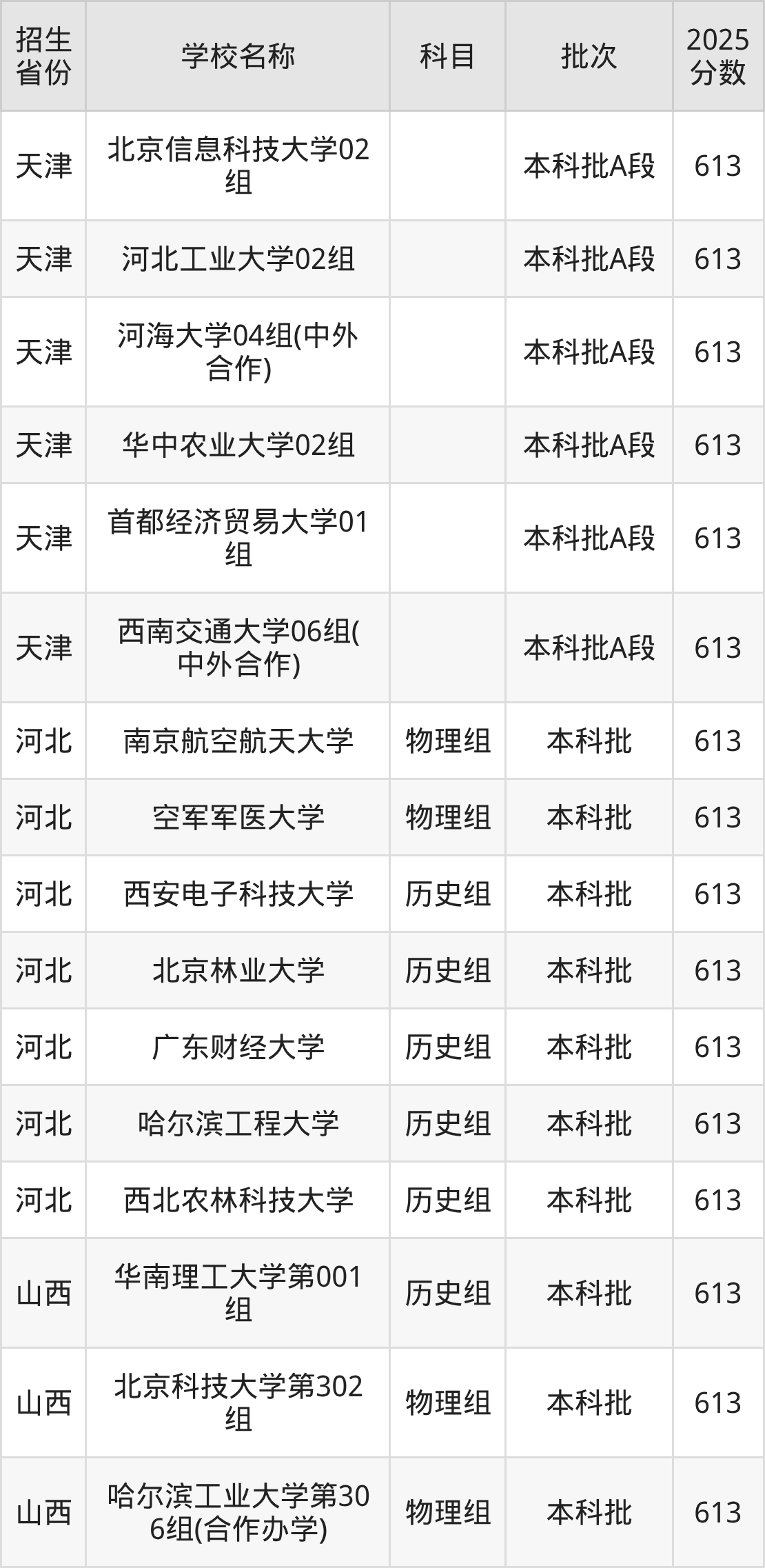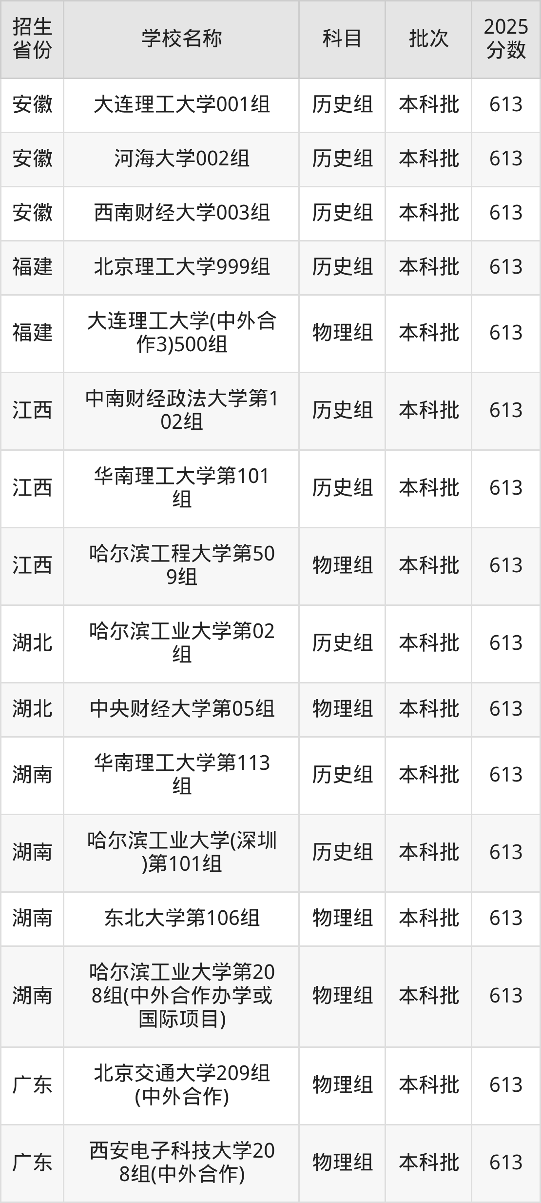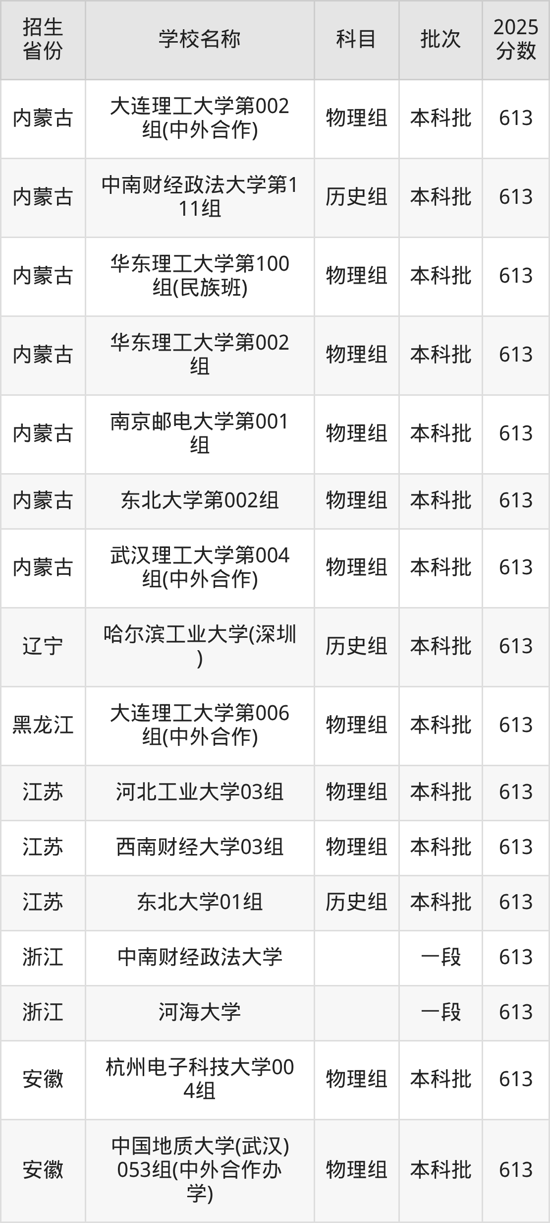 筛选全国各省2025年录取分数线为613分的理科大学如下: