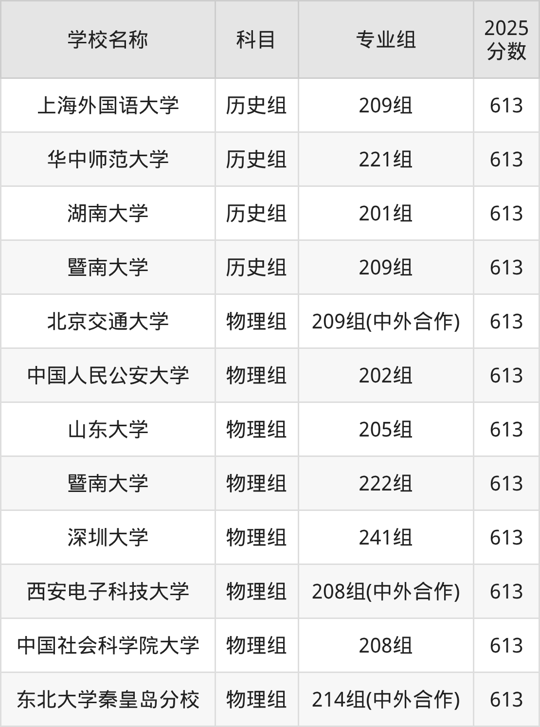 广东高考录取分数线在613分左右的公办院校专业组一共有12个,其中历史组有:上海外国语大学(613分)、华中师范大学(613分)、湖南大学(613分),物理组有:北京交通大学(613分)、中国人民公安大学(613分)、山东大学(613分)。