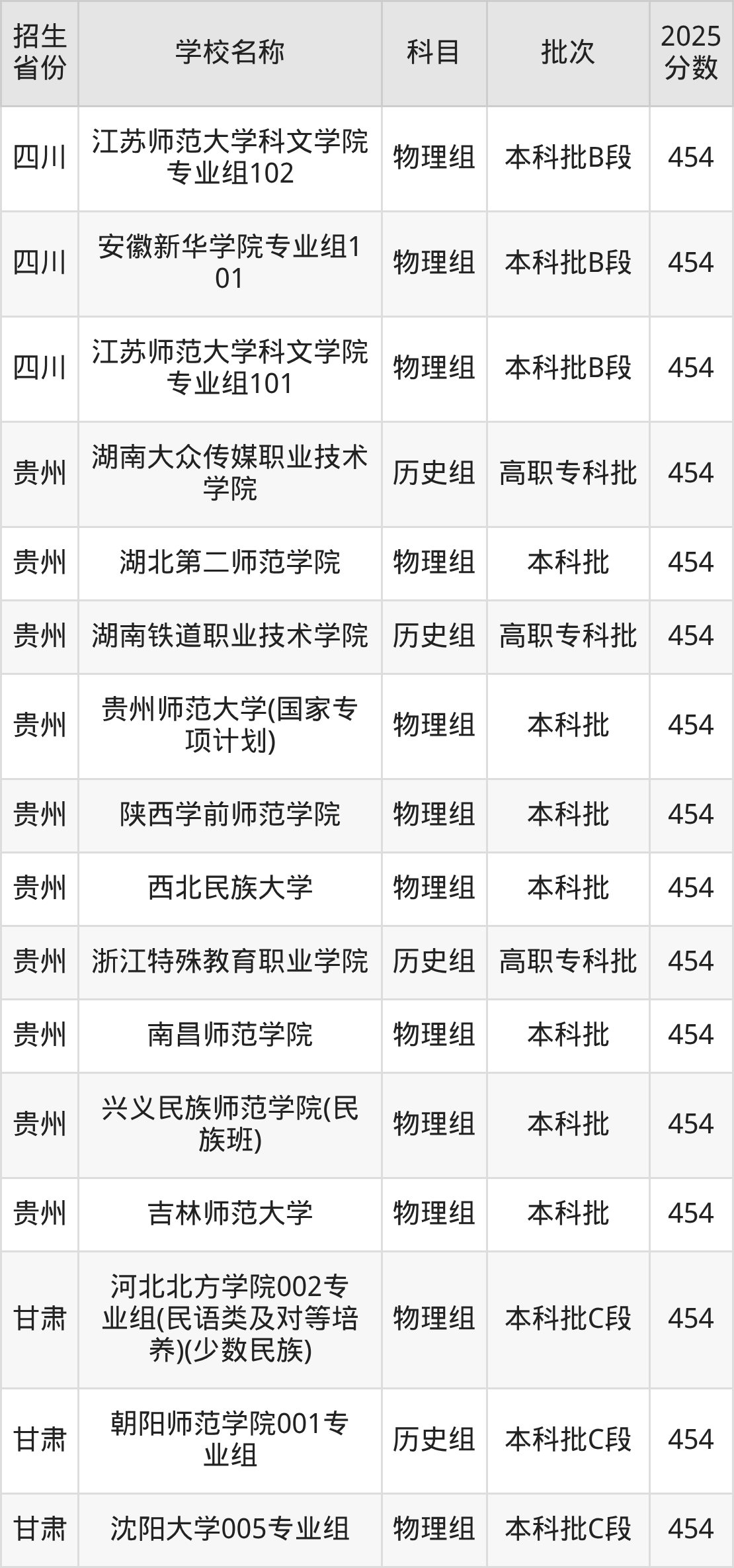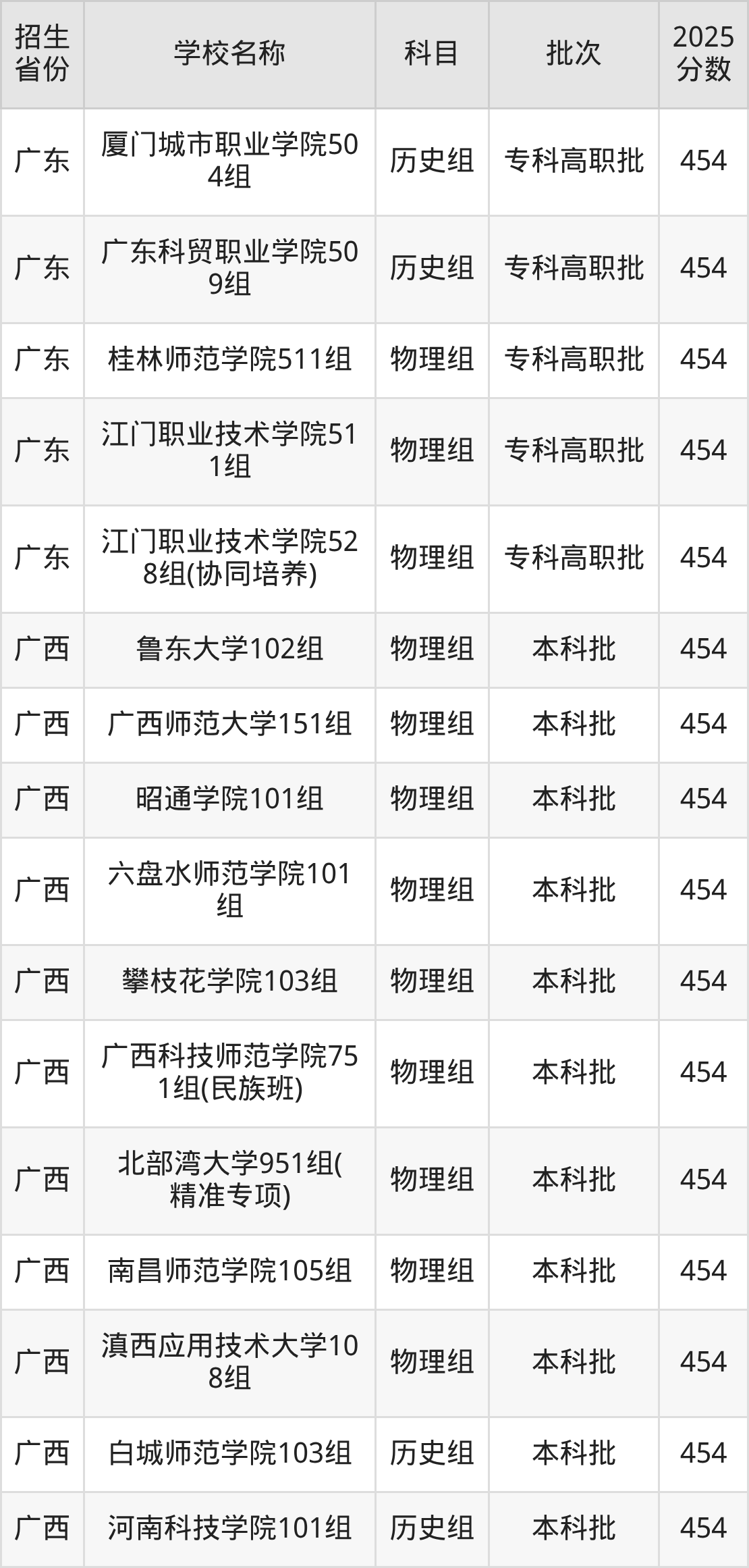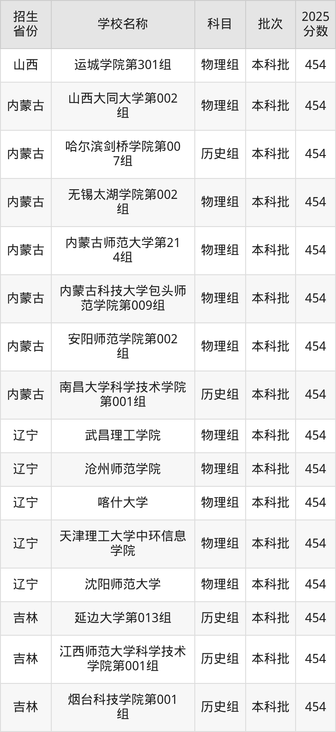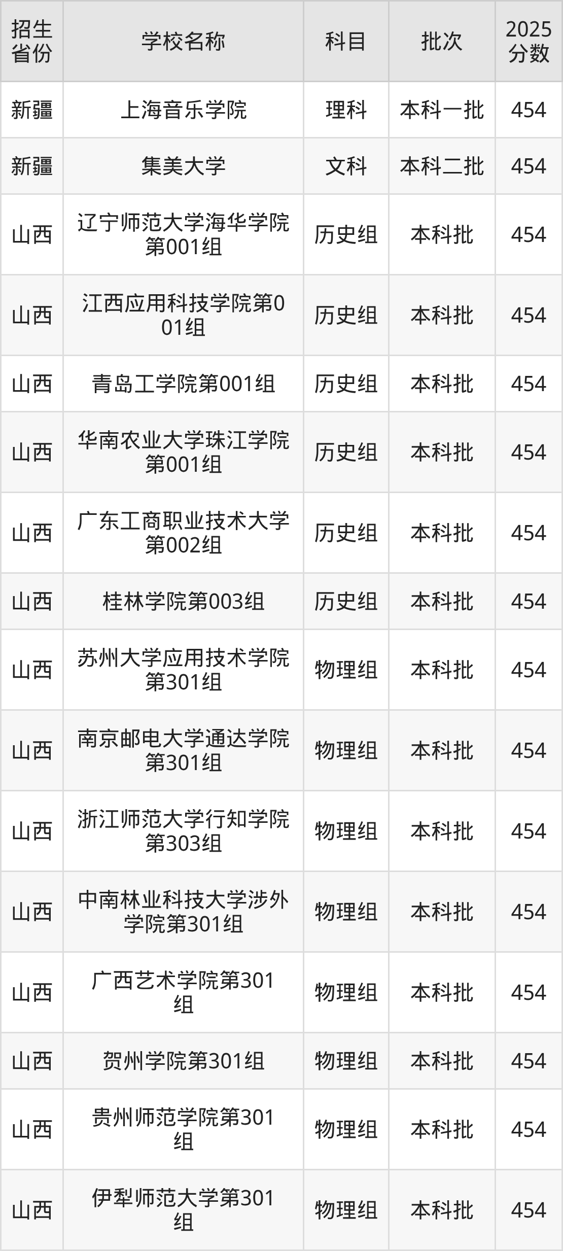 筛选全国各省2025年录取分数线为454分的文科大学如下: