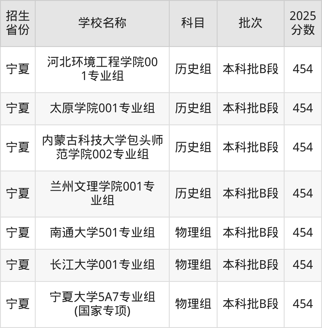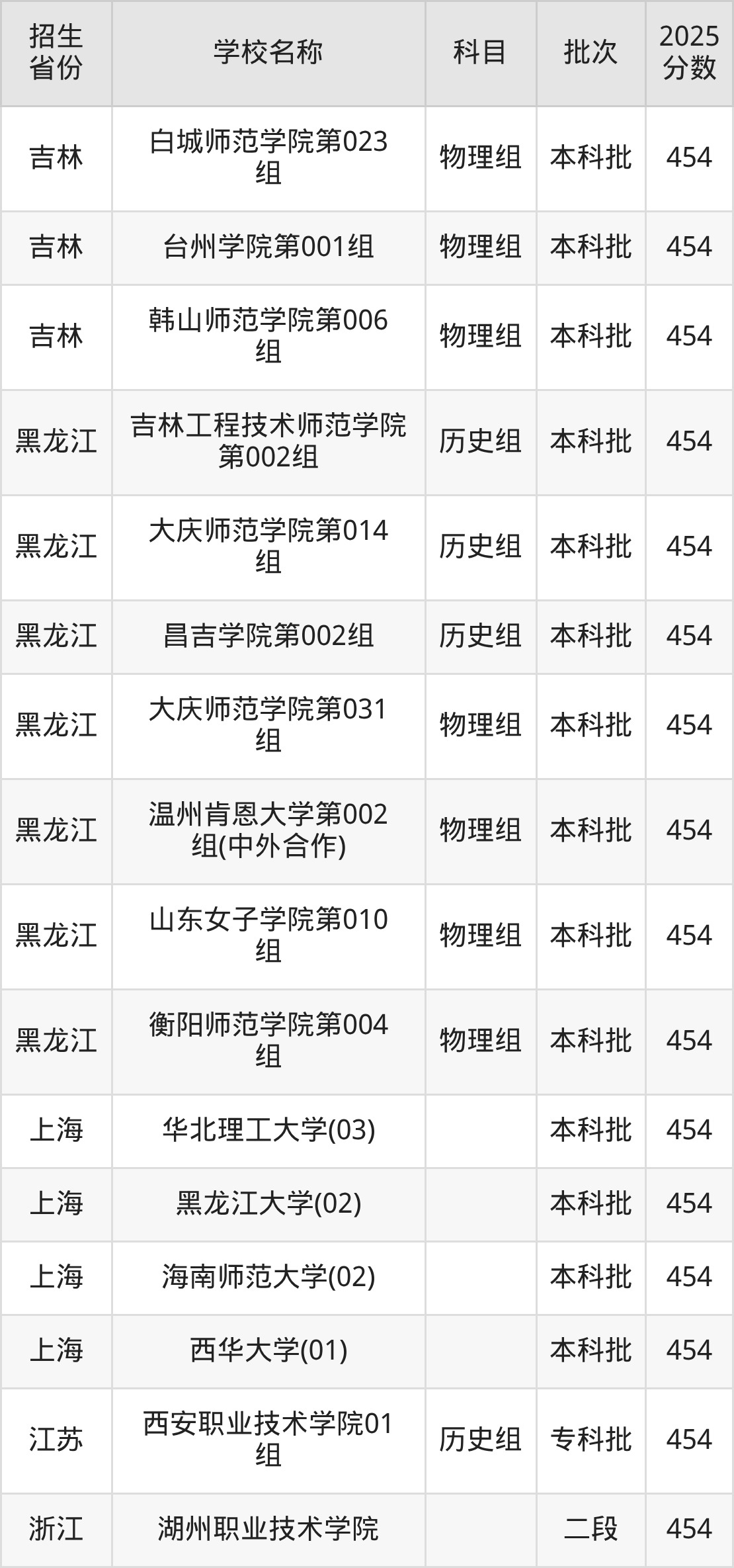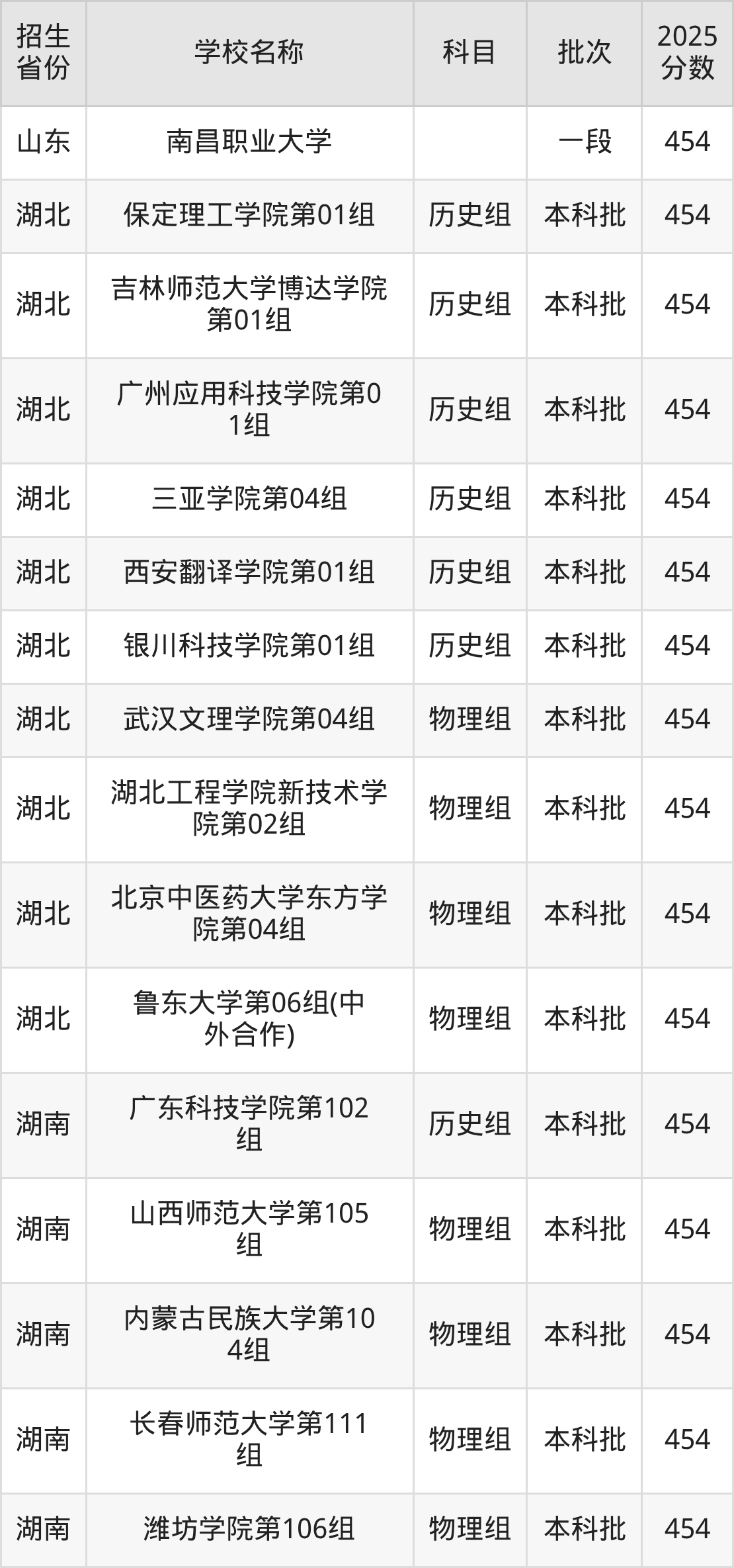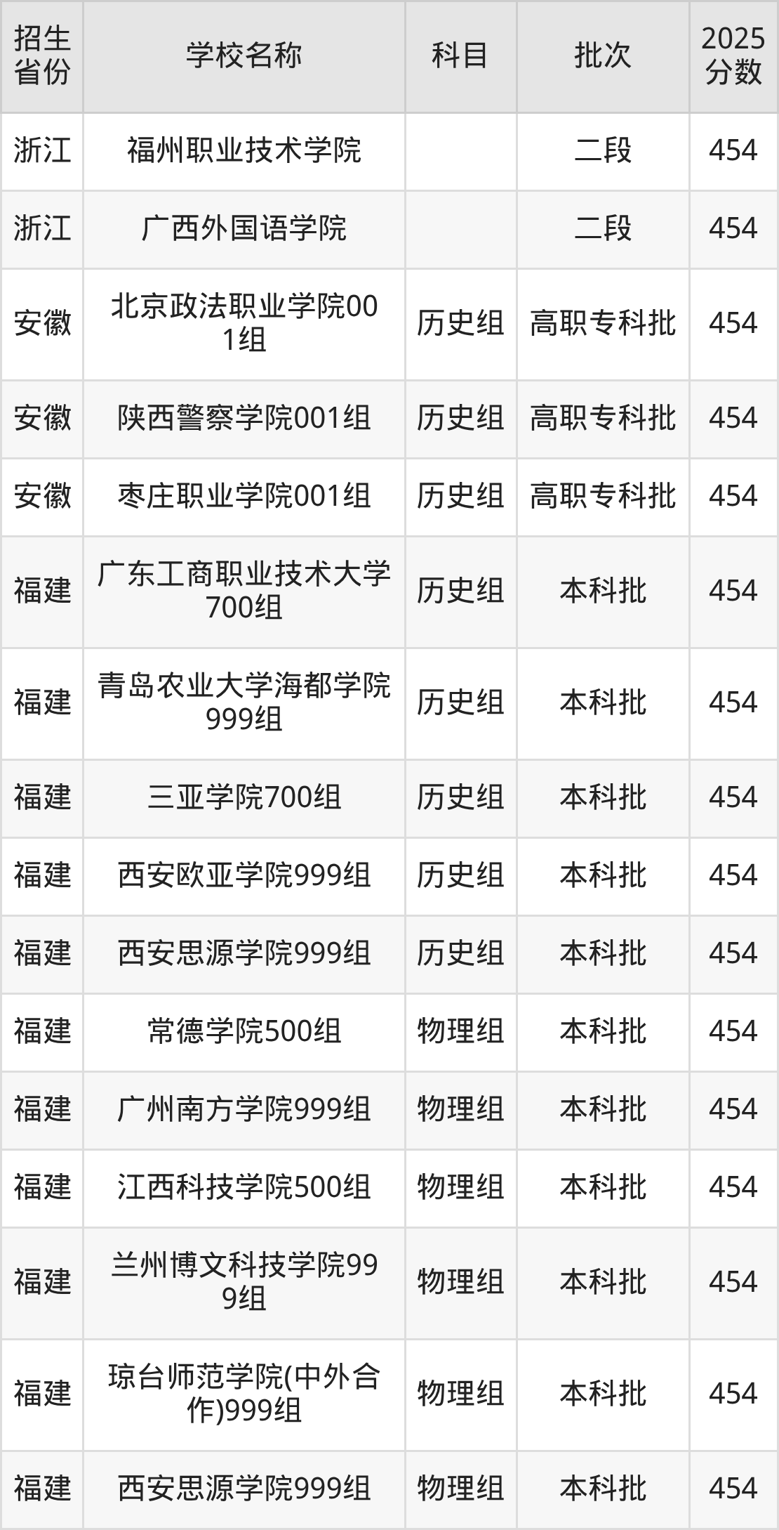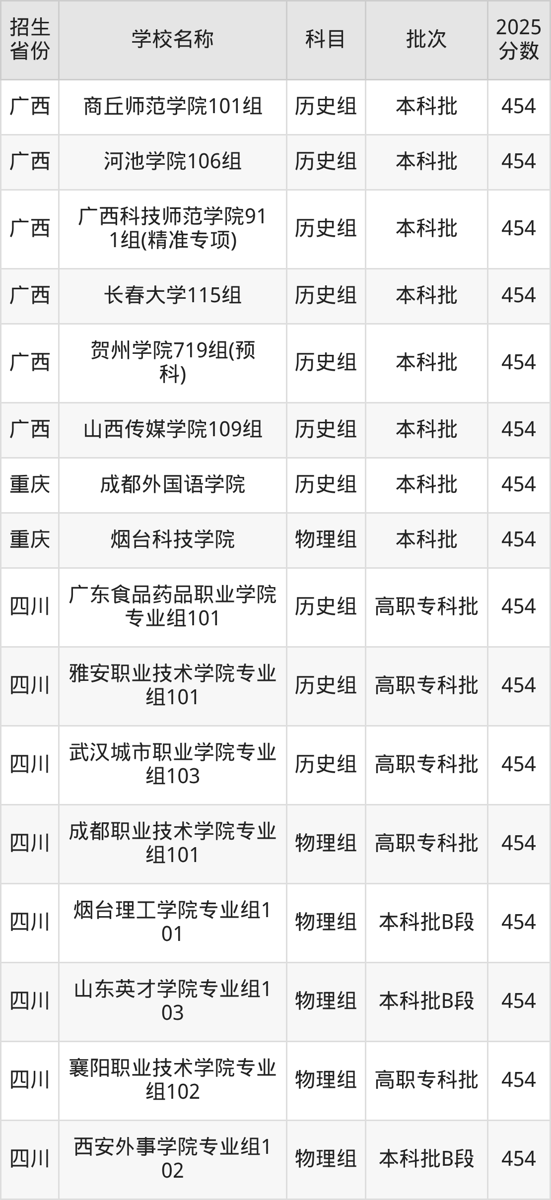 筛选全国各省2025年录取分数线为454分的文科大学如下:
