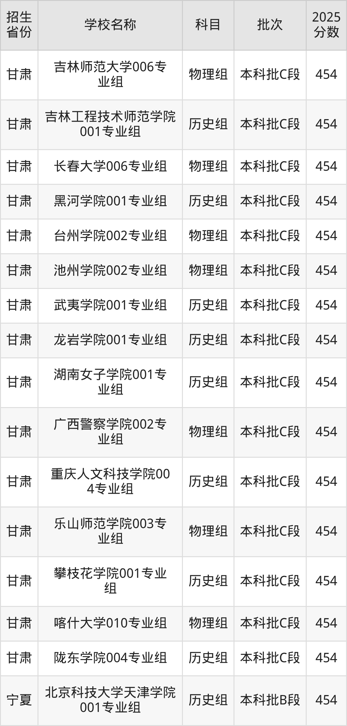 甘肃省物理组分数线是454分的文科大学有:河北北方学院、沈阳大学、吉林师范大学、长春大学、台州学院、池州学院、广西警察学院、乐山师范学院、喀什大学。