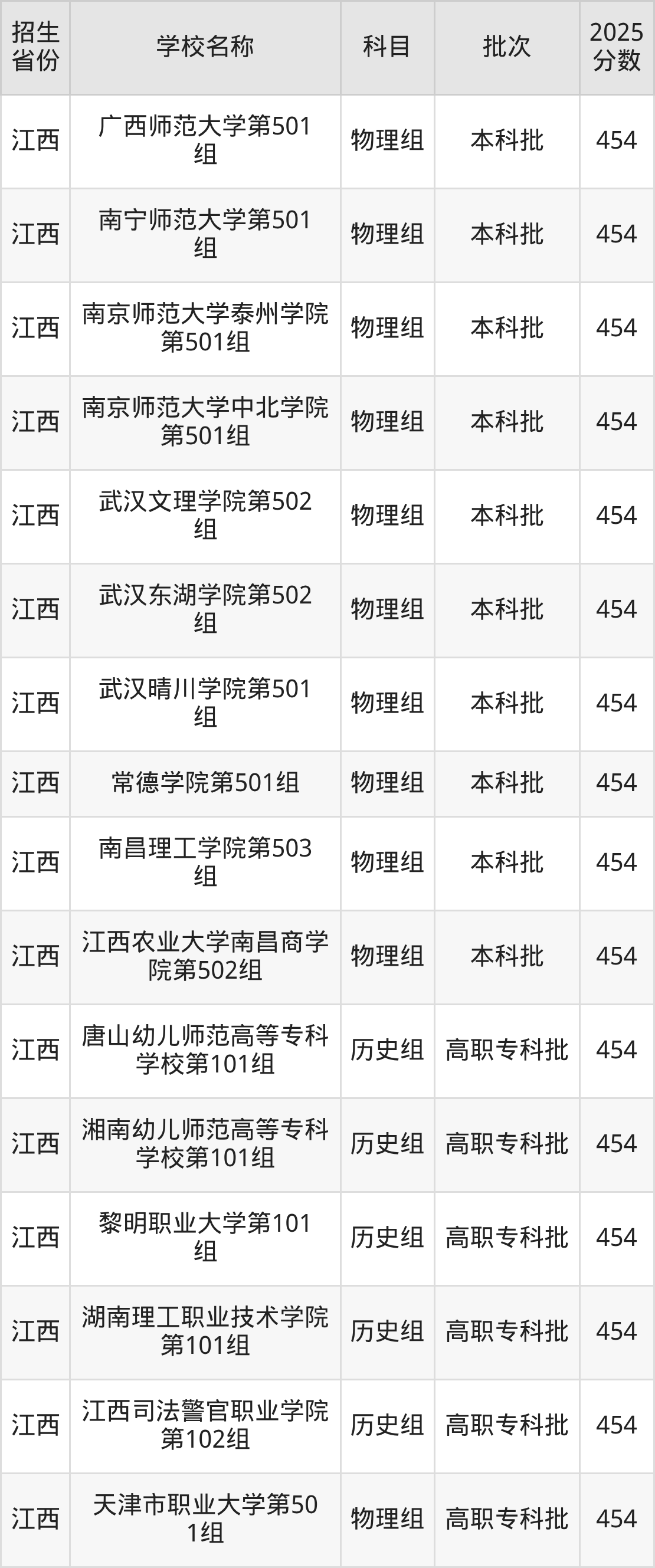 江西省历史组分数线是454分的文科大学有:唐山幼儿师范高等专科学校、湘南幼儿师范高等专科学校、黎明职业大学、湖南理工职业技术学院、江西司法警官职业学院。