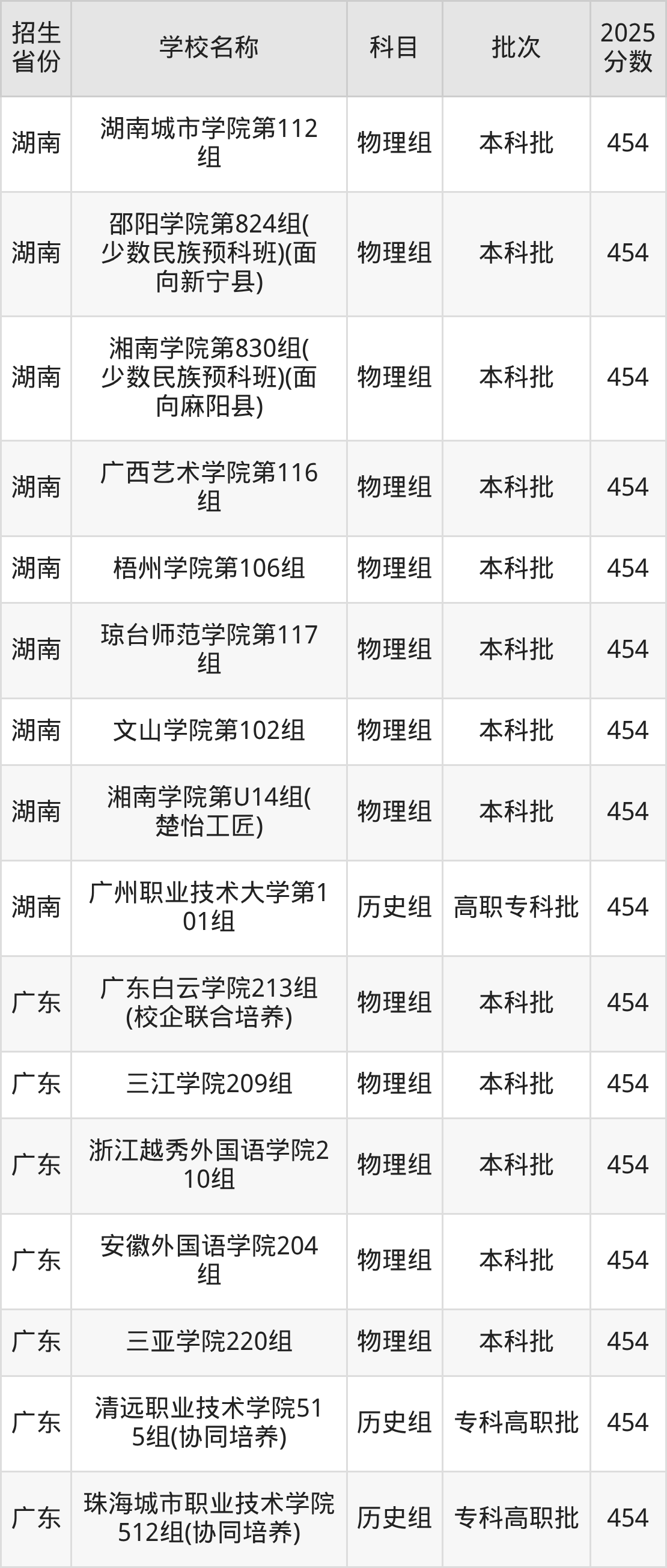 湖南省历史组分数线是454分的文科大学有:广东科技学院、广州职业技术大学。