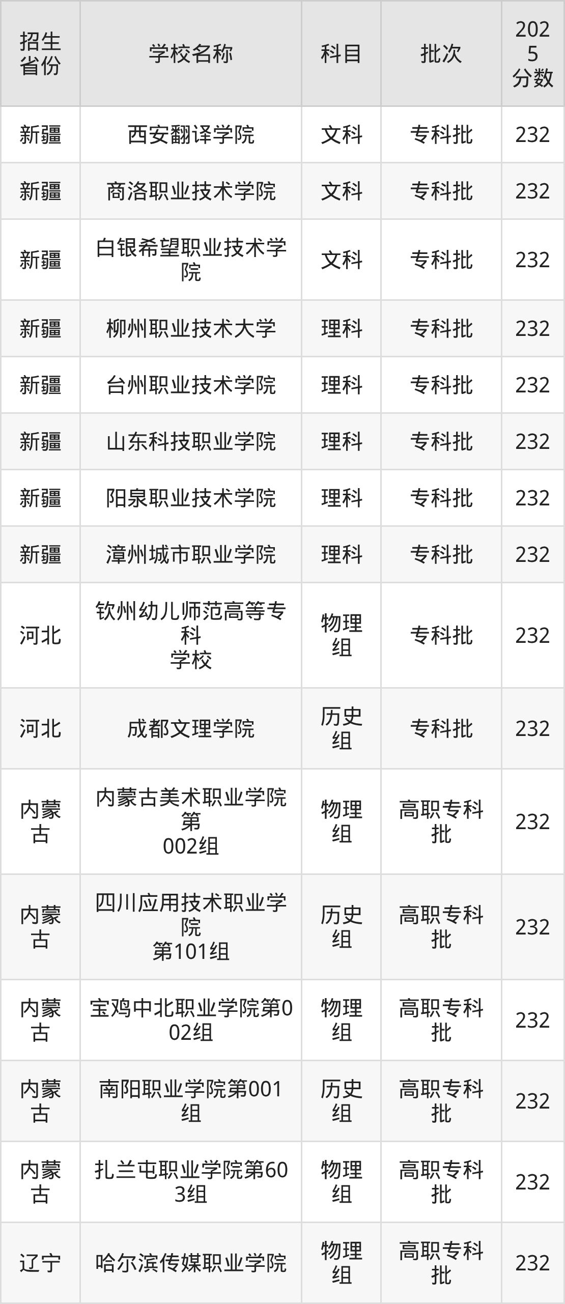 筛选全国各省2025年录取分数线为232分的文科大学如下: