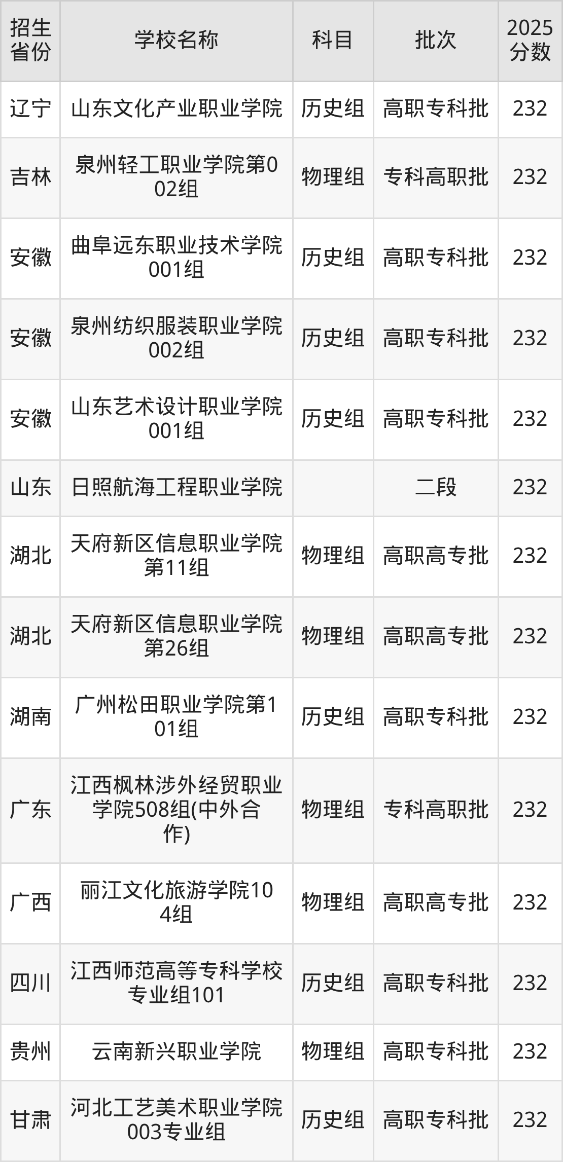 辽宁省历史组分数线是232分的文科大学有:山东文化产业职业学院。