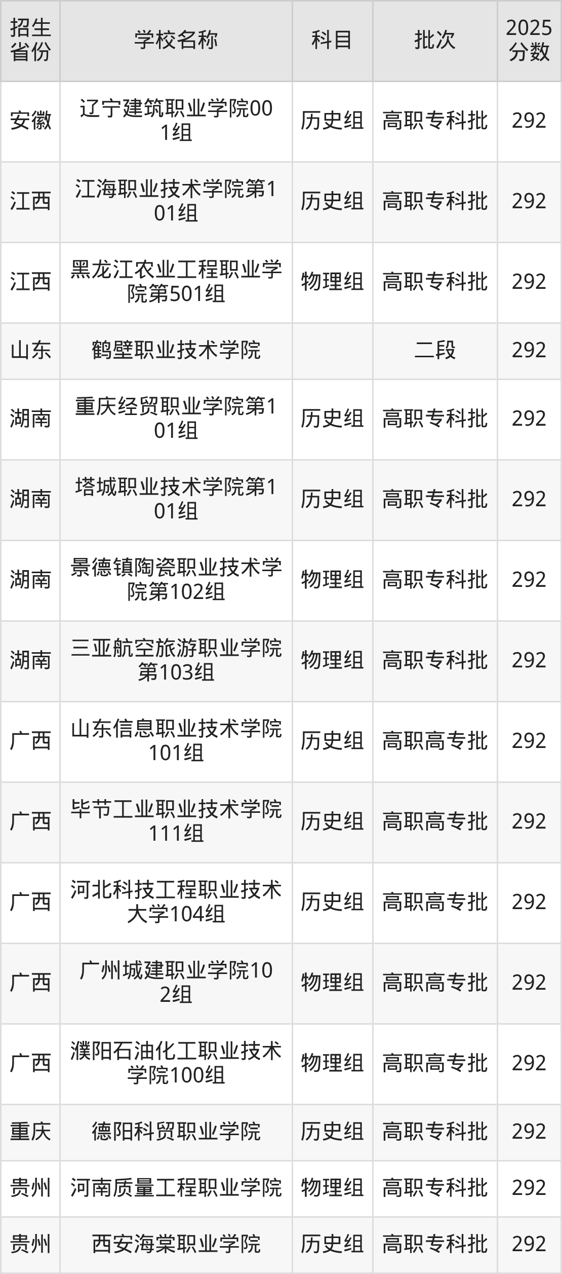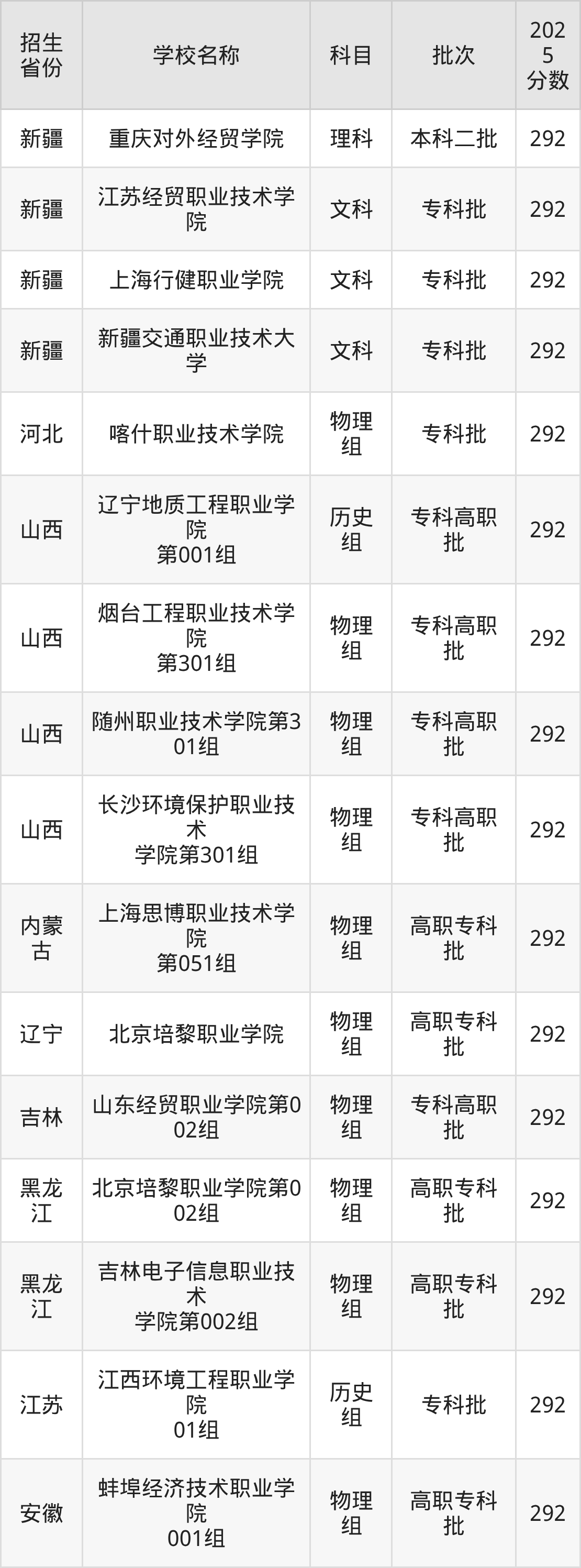 筛选全国各省2025年录取分数线为292分的理科大学如下: