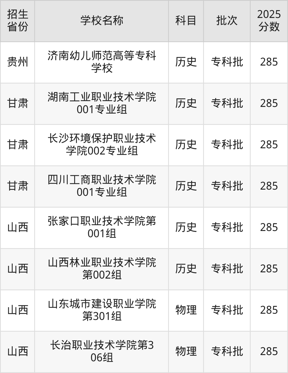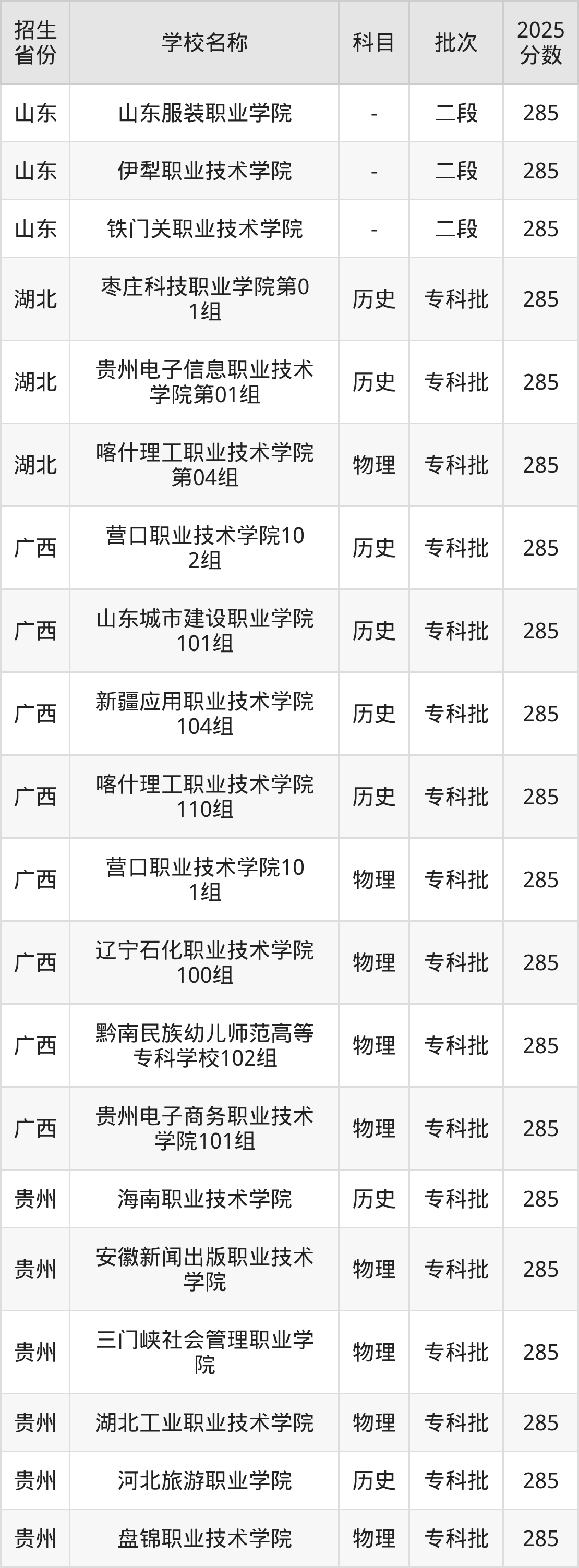 筛选全国各省2025年录取分数线为285分的公办专科大学如下: