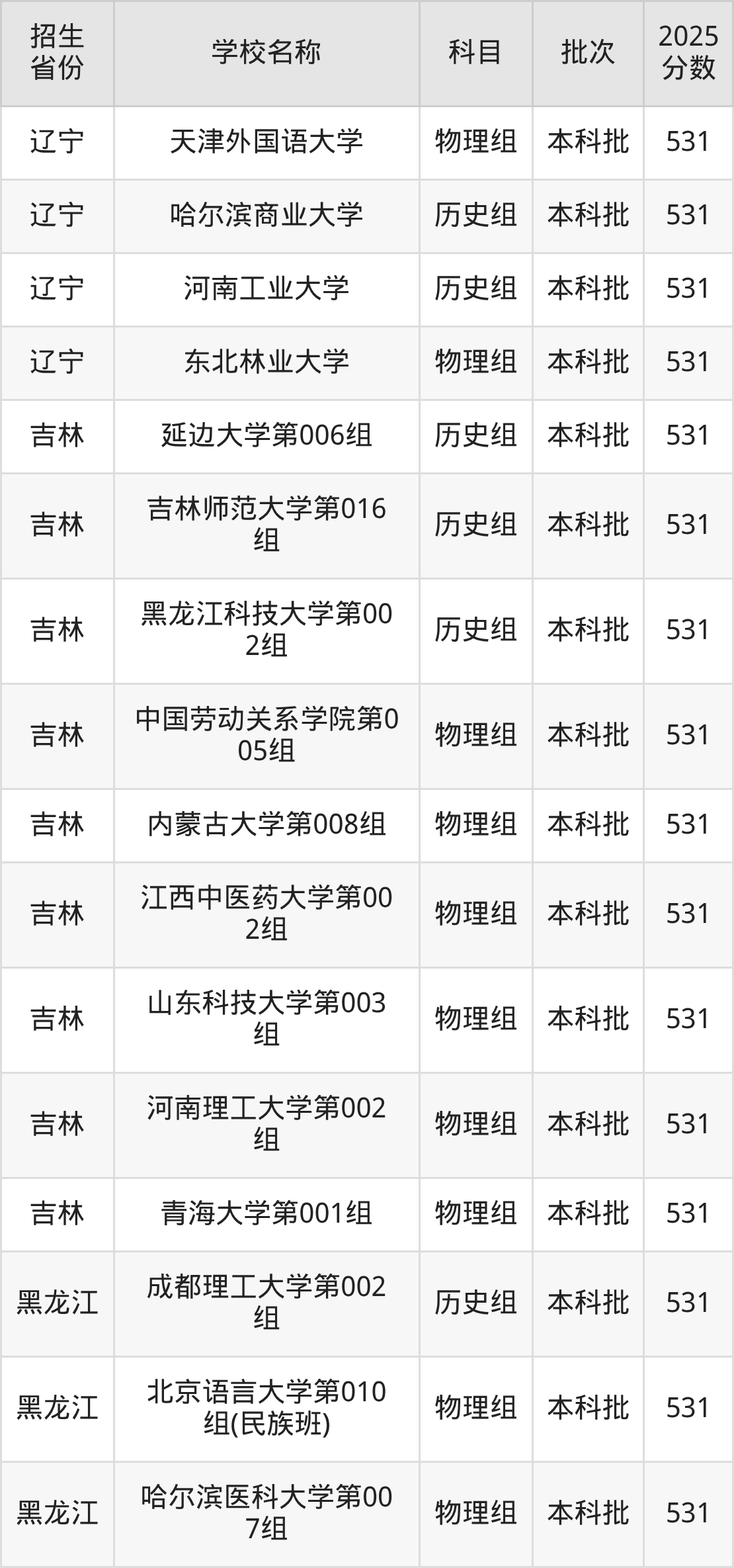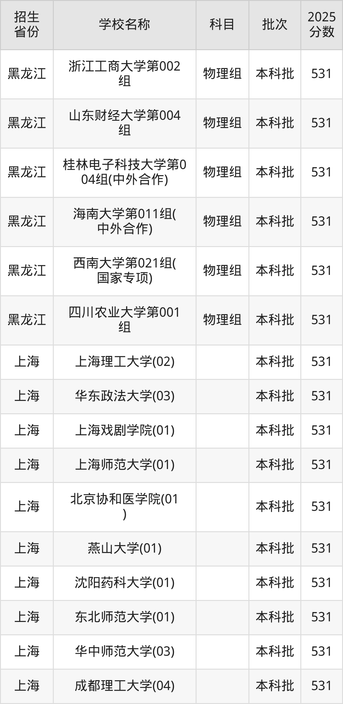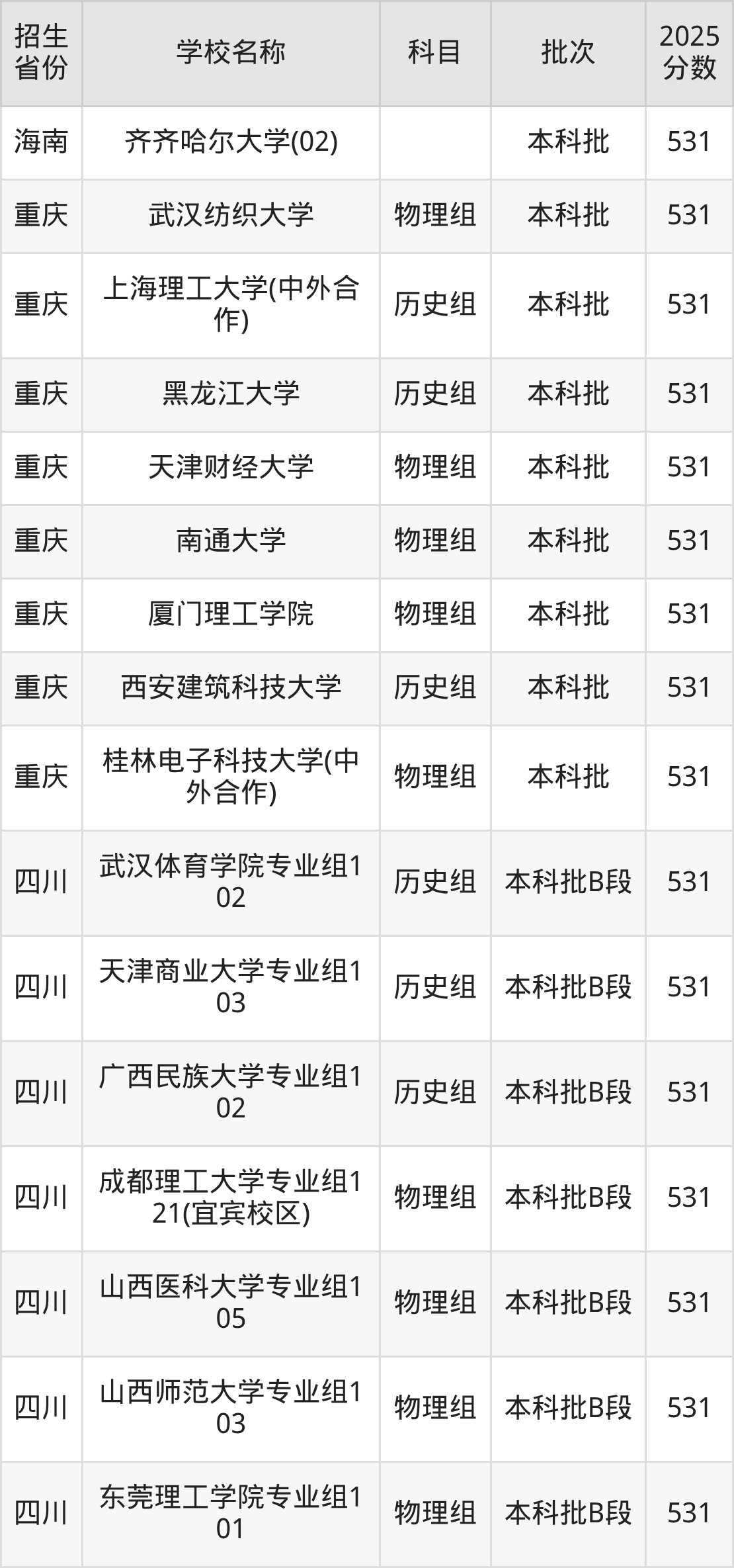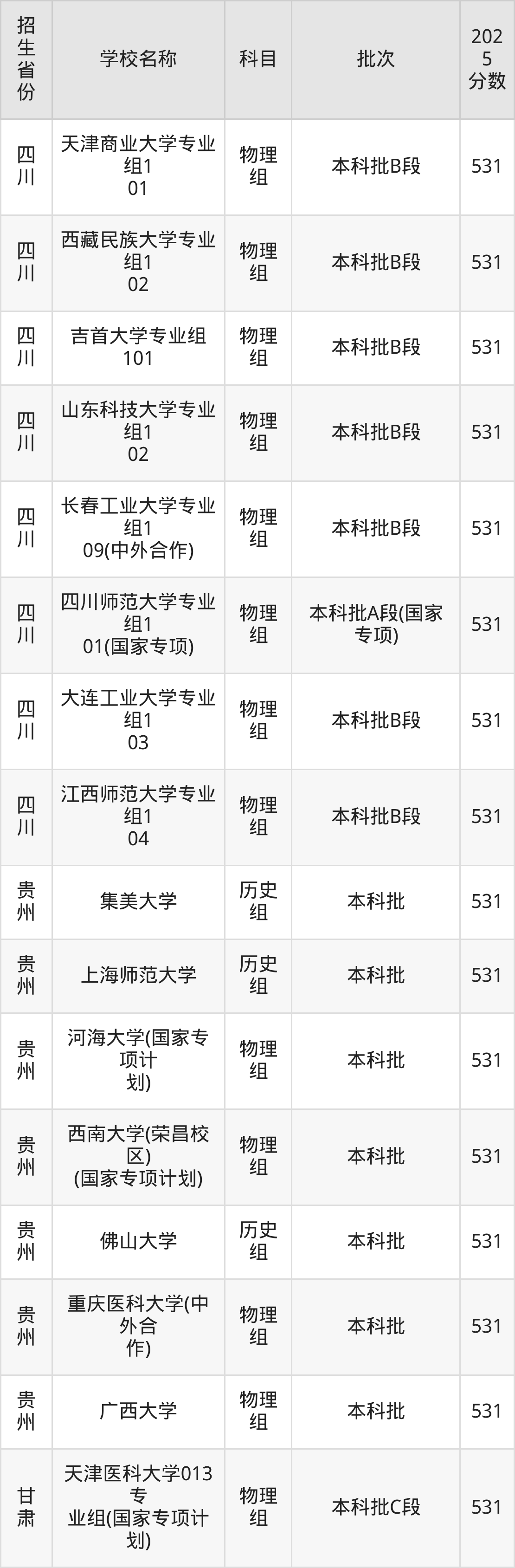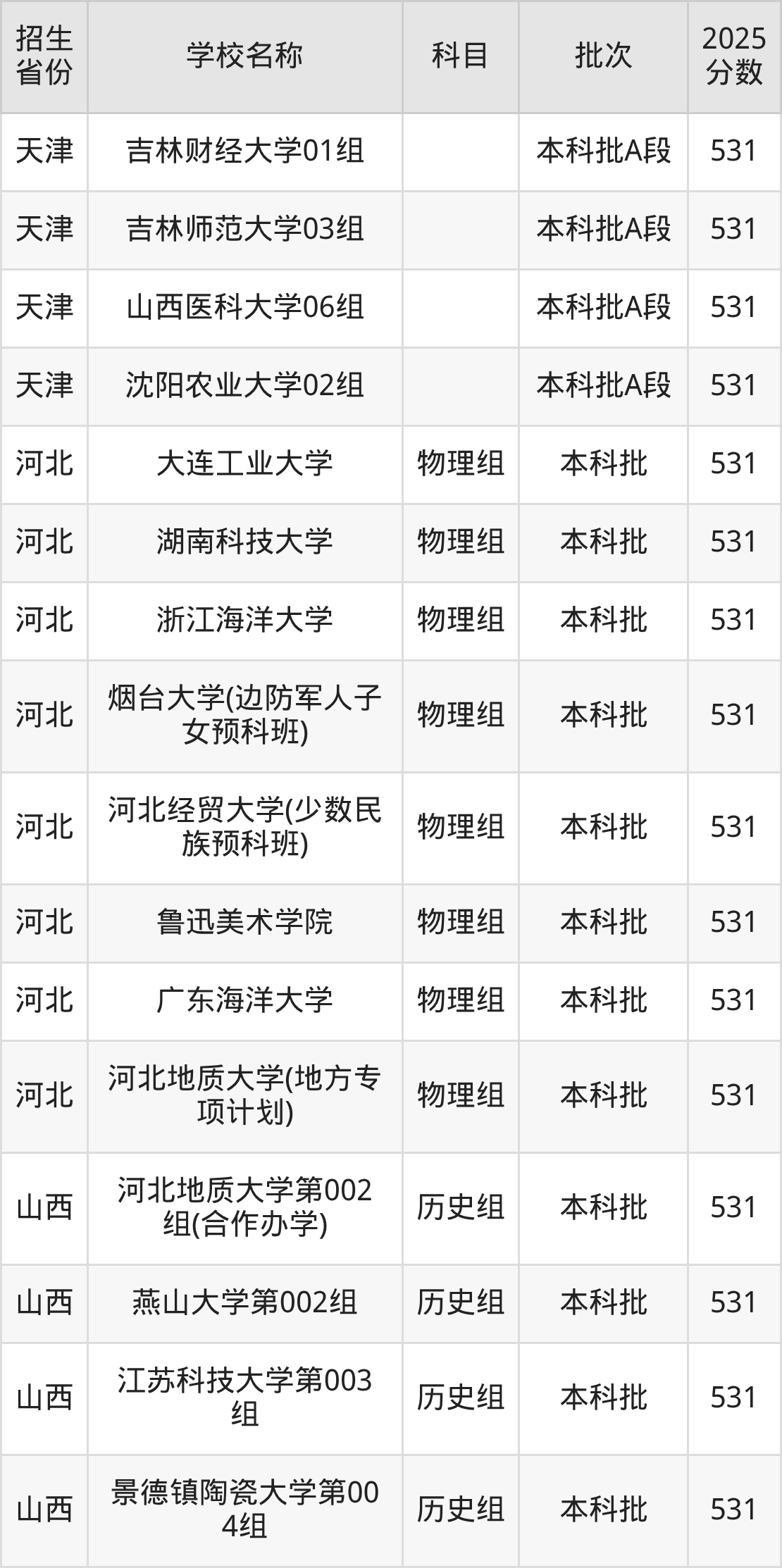 筛选全国各省2025年录取分数线为531分的重点大学如下: