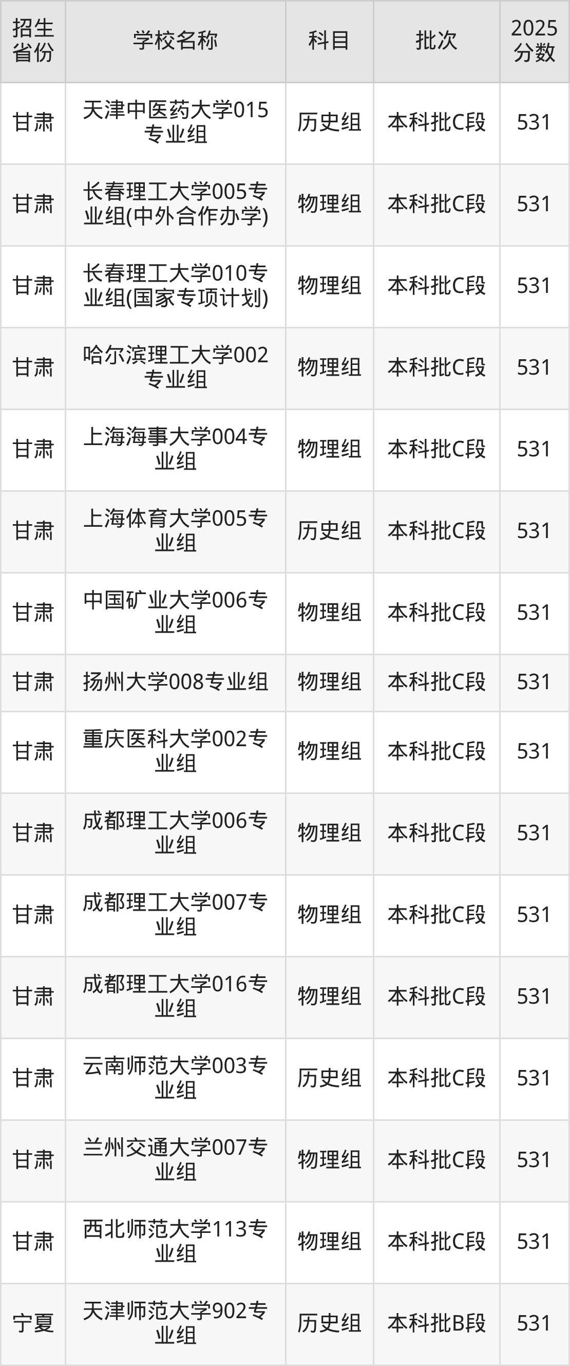 甘肃省历史组分数线是531分的重点大学有:天津中医药大学、上海体育大学、云南师范大学。