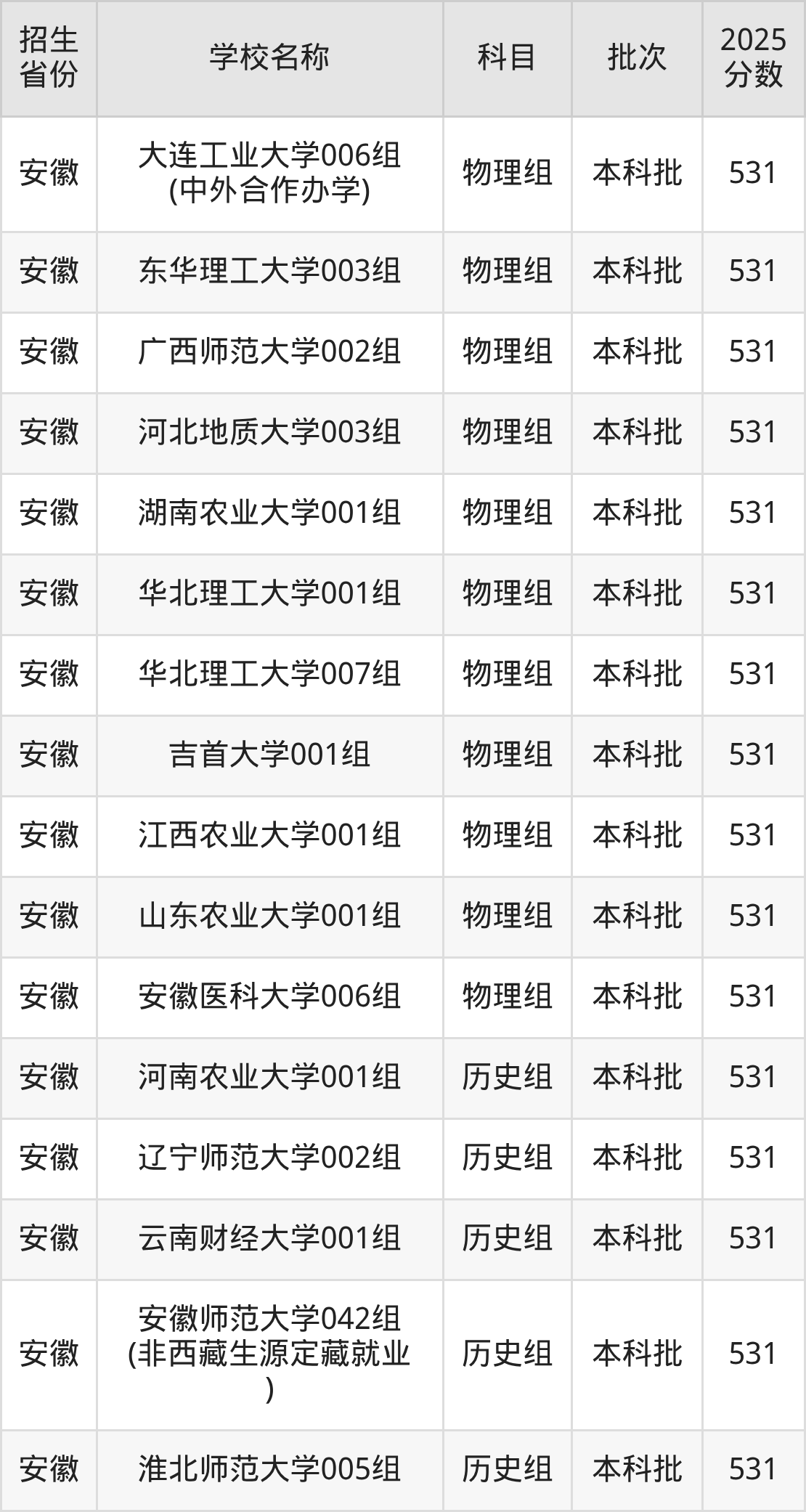 安徽省历史组分数线是531分的重点大学有:河南农业大学、辽宁师范大学、云南财经大学、安徽师范大学、淮北师范大学。