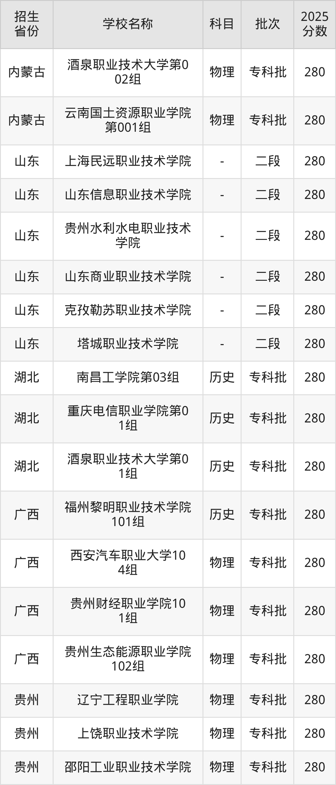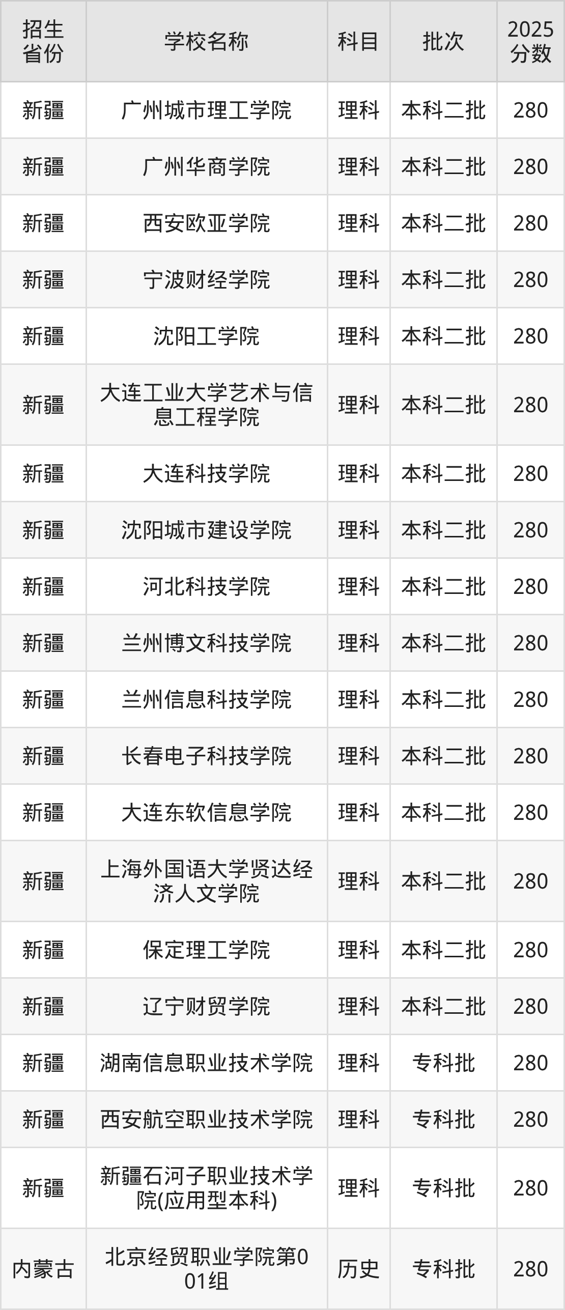 筛选全国各省2025年录取分数线为280分的理科大学如下: