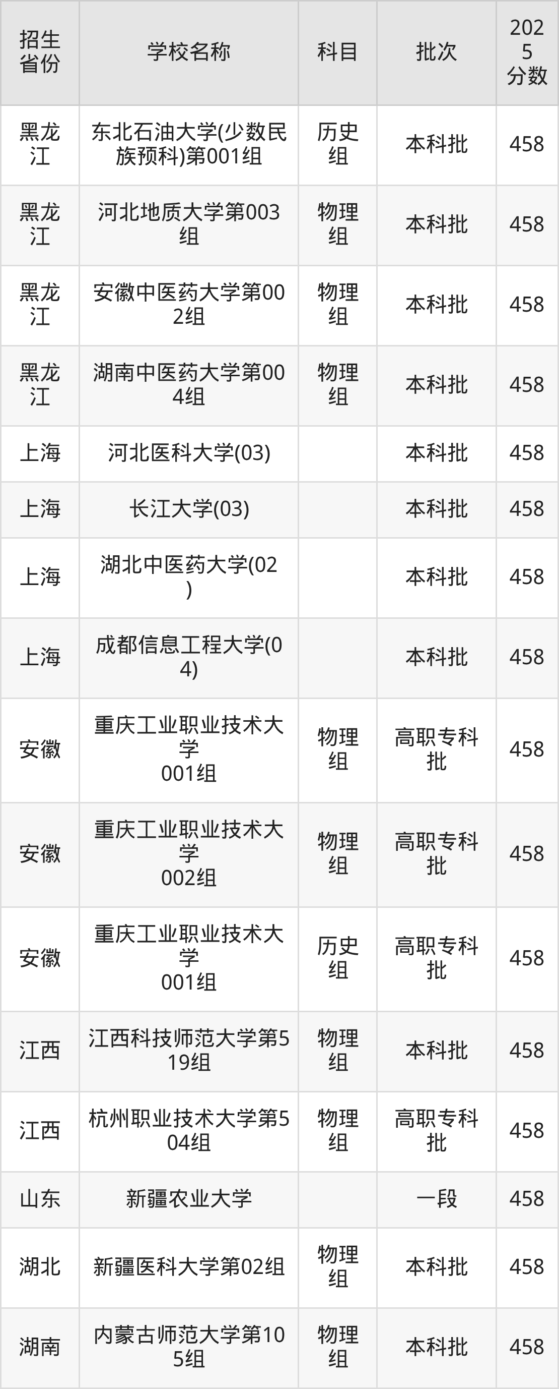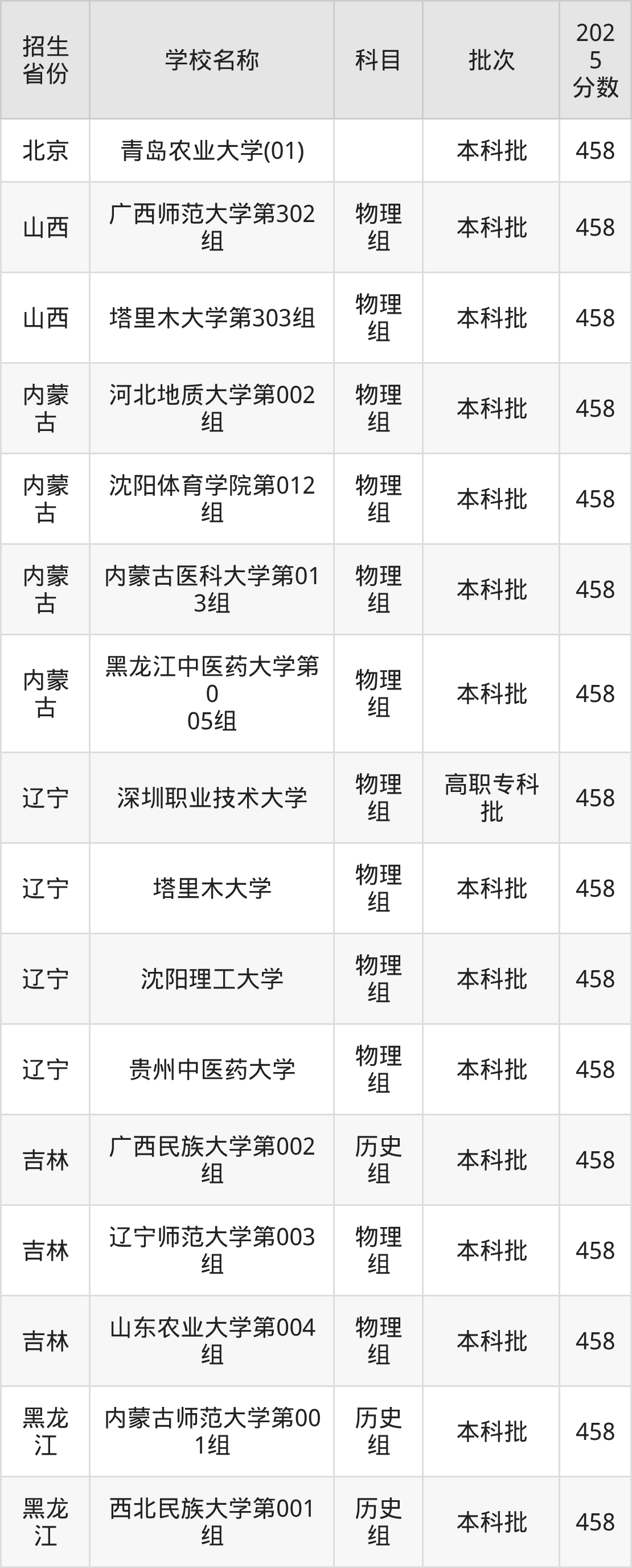 筛选全国各省2025年录取分数线为458分的重点大学如下: