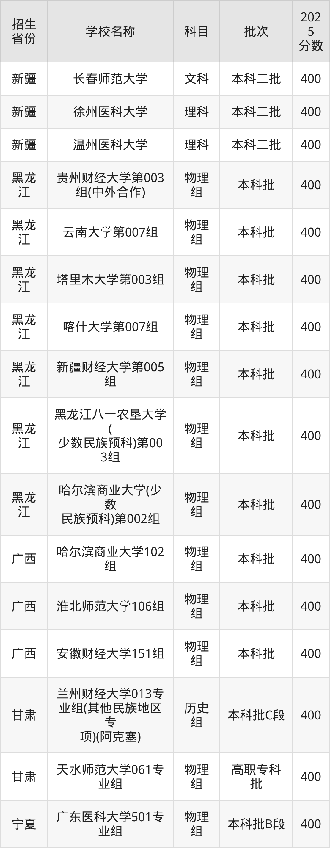筛选全国各省2025年录取分数线为400分的一本大学如下: